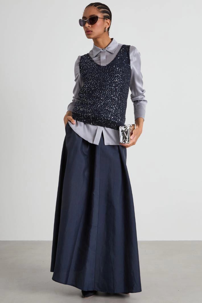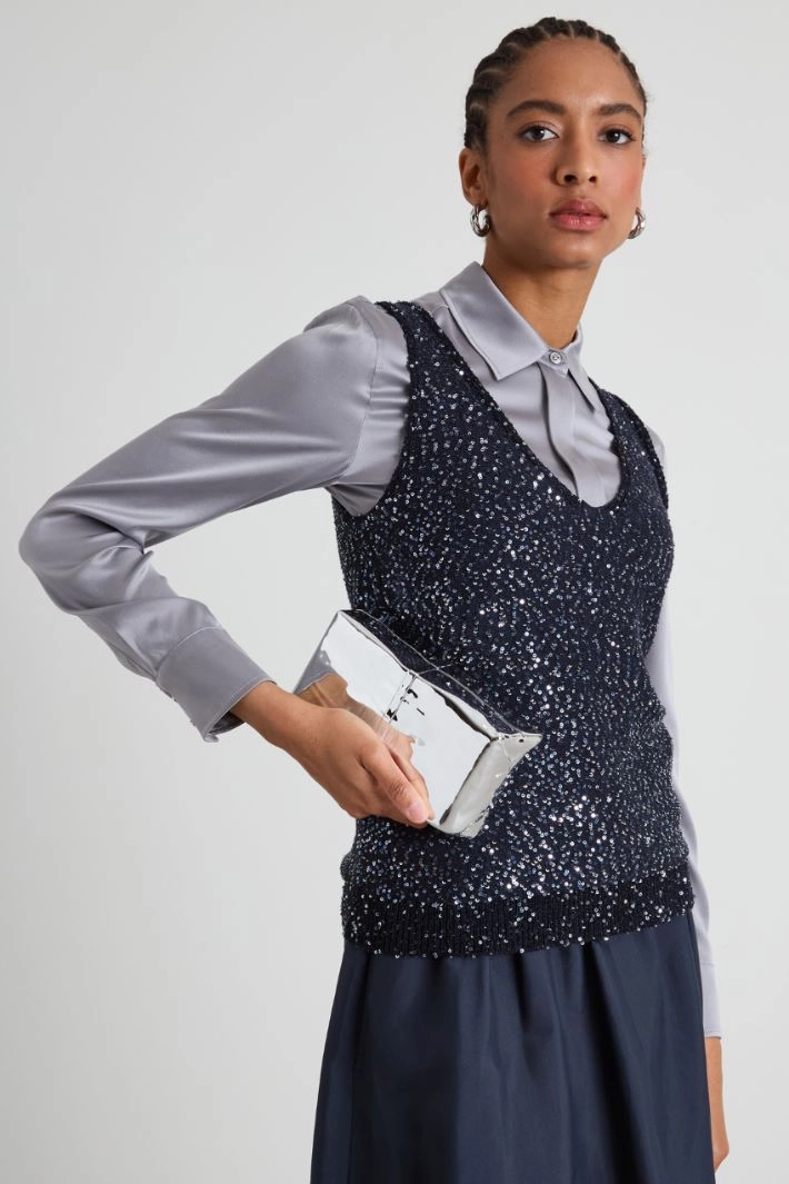 Straight-cut top in cotton blend jersey, with matching embroidered micro sequins, V-neck and wide shoulder straps.