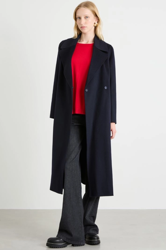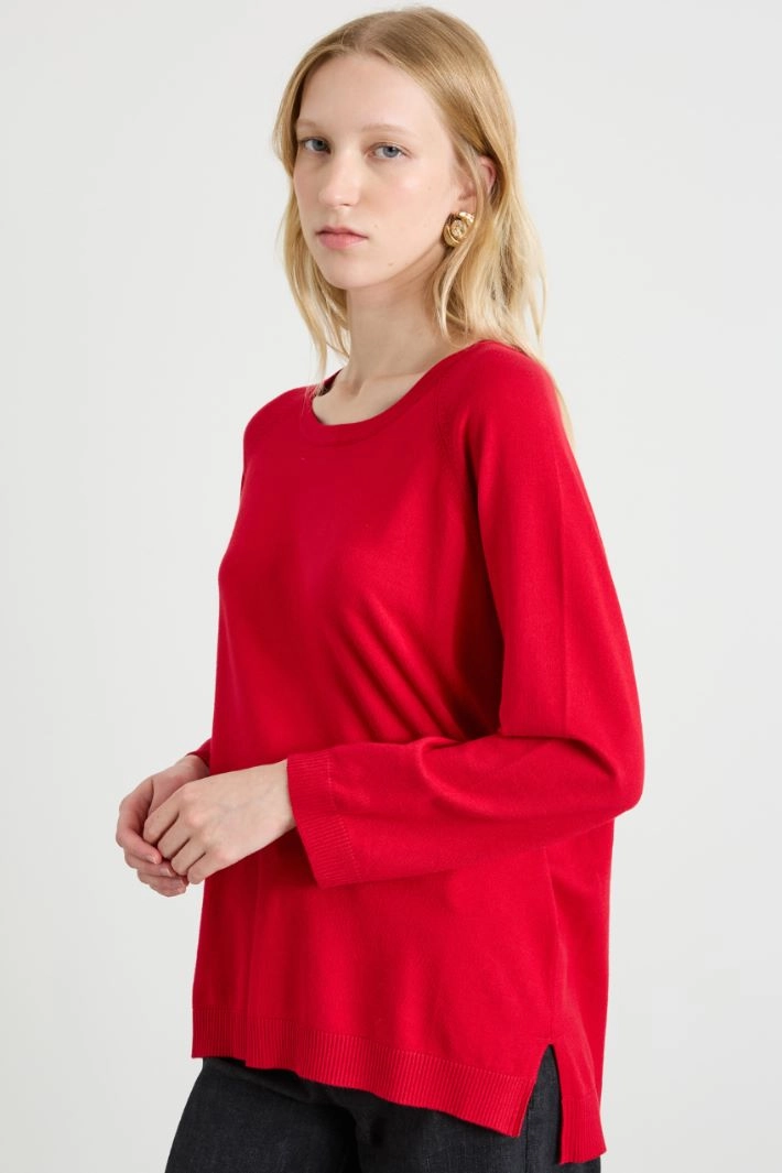 Straight-cut sweater in viscose blend yarn, with round neckline, long raglan sleeves and asymmetrical hem with side slits.