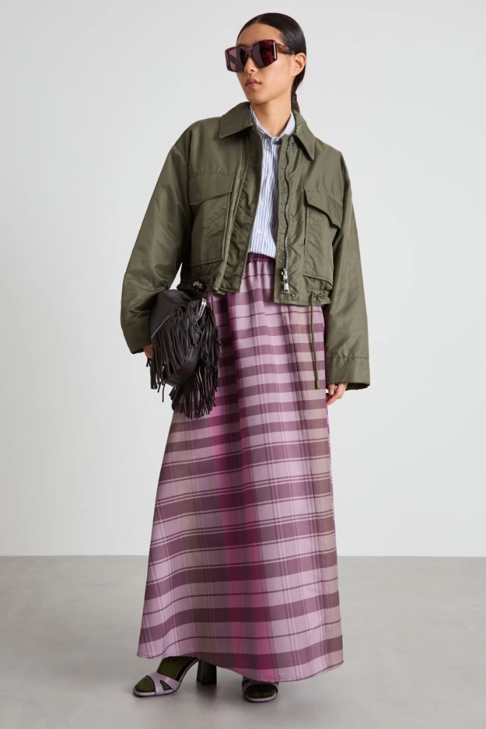 Regular-fit padded bomber jacket in technical twill, with classic collar, long sleeves with wrist strap, maxi patch pockets with flap and drawstring hem. Hidden fastening with zip and snap buttons. Reversible garment with quilted interior.