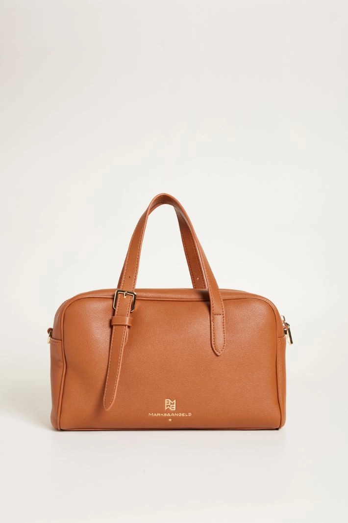 Maxi bowling bag in coated fabric with a hammered finish, featuring a lined interior with a card slot, adjustable buckled handles, and an adjustable and removable shoulder strap. Zip fastening.
