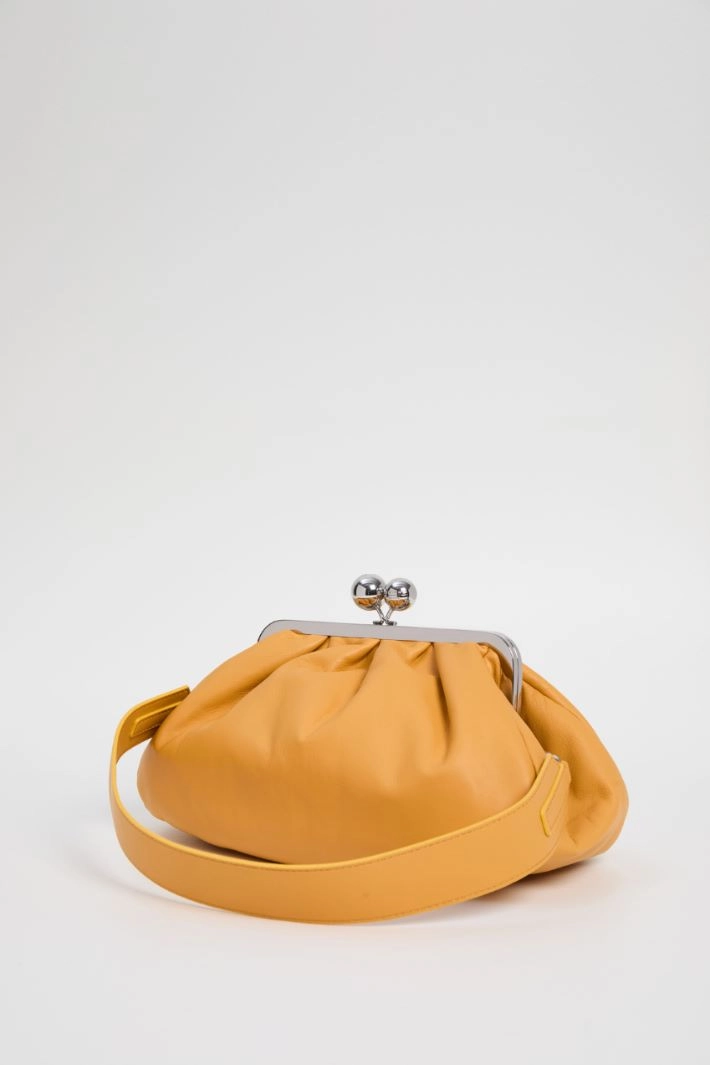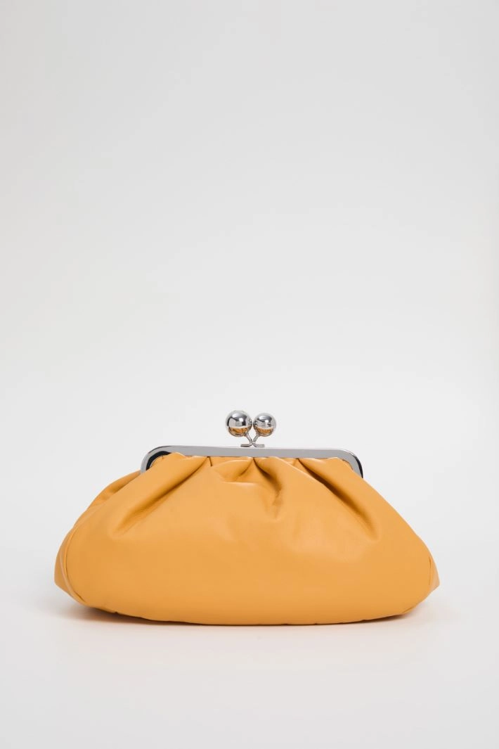 Clutch bag in genuine nappa leather, with removable chain shoulder strap and shoulder pad, snap closure with spheres and lined interior with pocket.