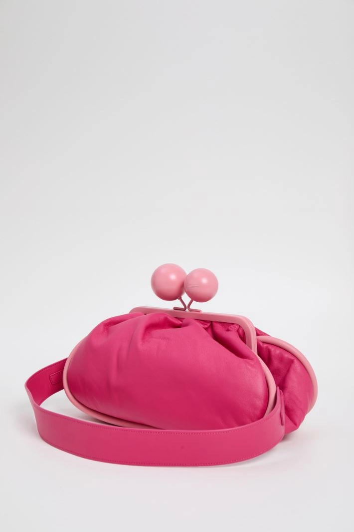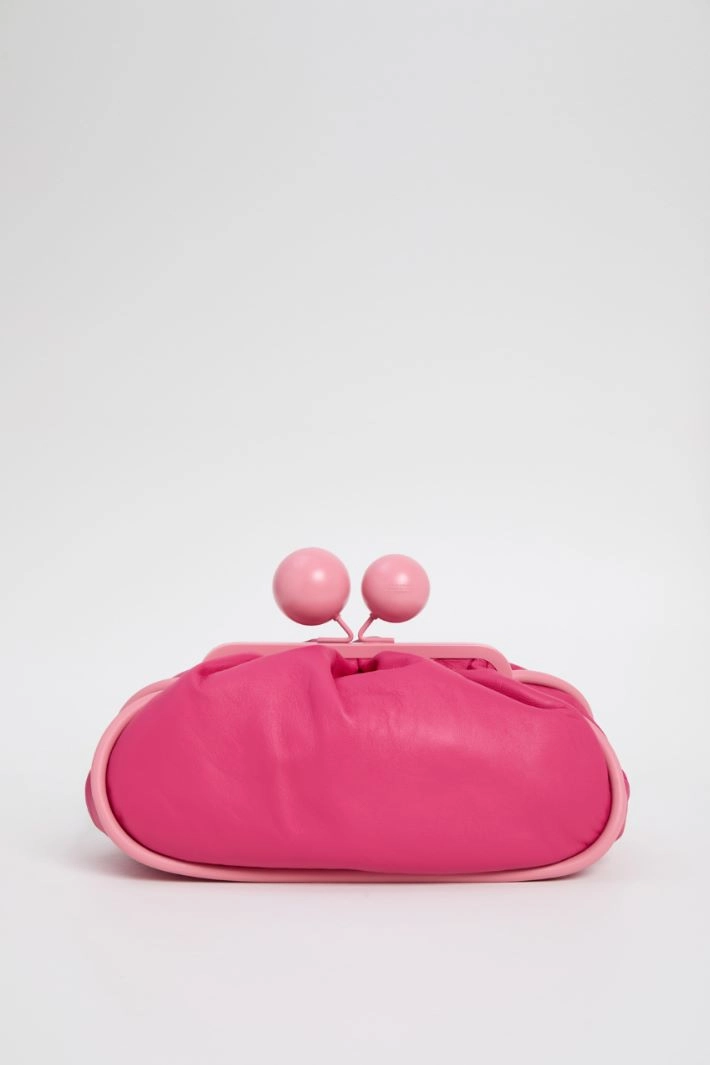 Clutch in genuine nappa leather, with contrasting profiles, removable chain shoulder strap and shoulder pad and magnetic closure with maxi spheres. Lined interior with pocket.