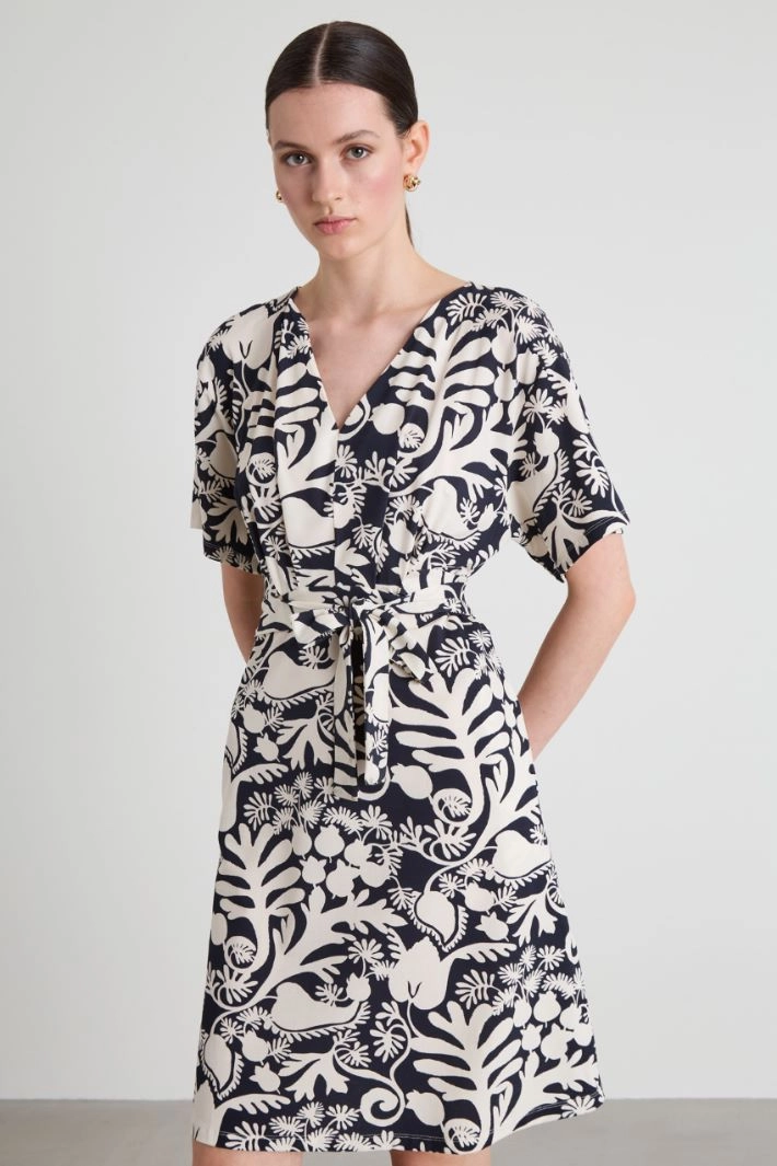 Slightly flared dress in stretch natural fibre jersey, with V-neck, short sleeves, inset pockets and matching belt.