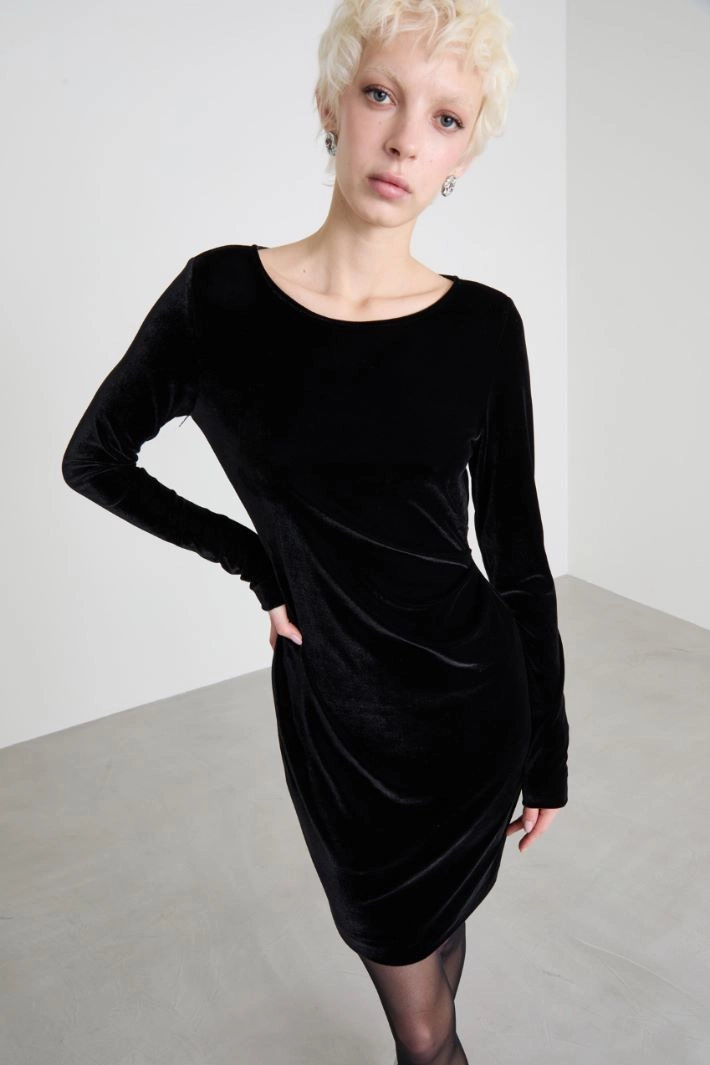 Fitted dress in stretch velvet, with a round neckline, long sleeves and a gathered motif on the side.