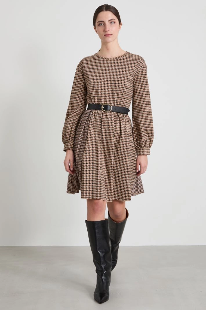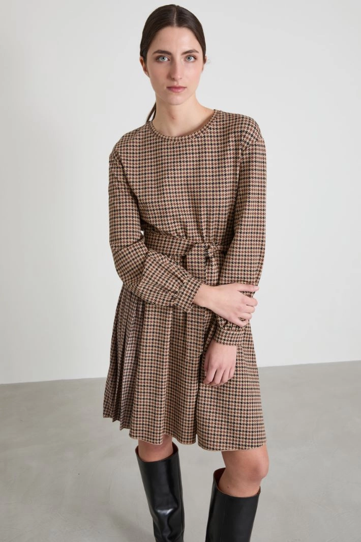 A-line, loose-fitting dress in printed cotton and viscose blend jersey, featuring a crew neck, long sleeves with cuffs, an elastic waistband, and a pleated skirt. Removable matching belt.