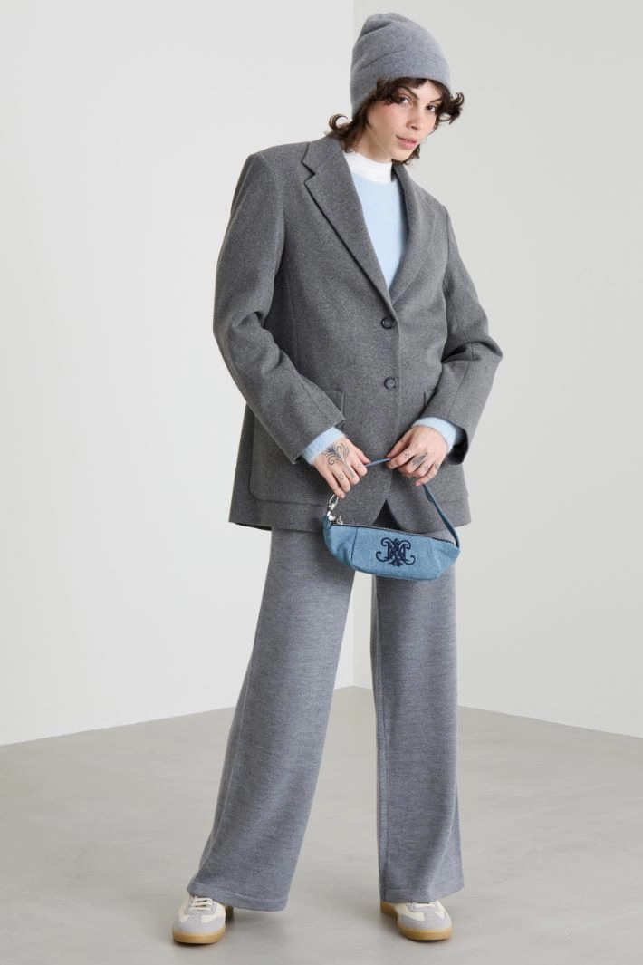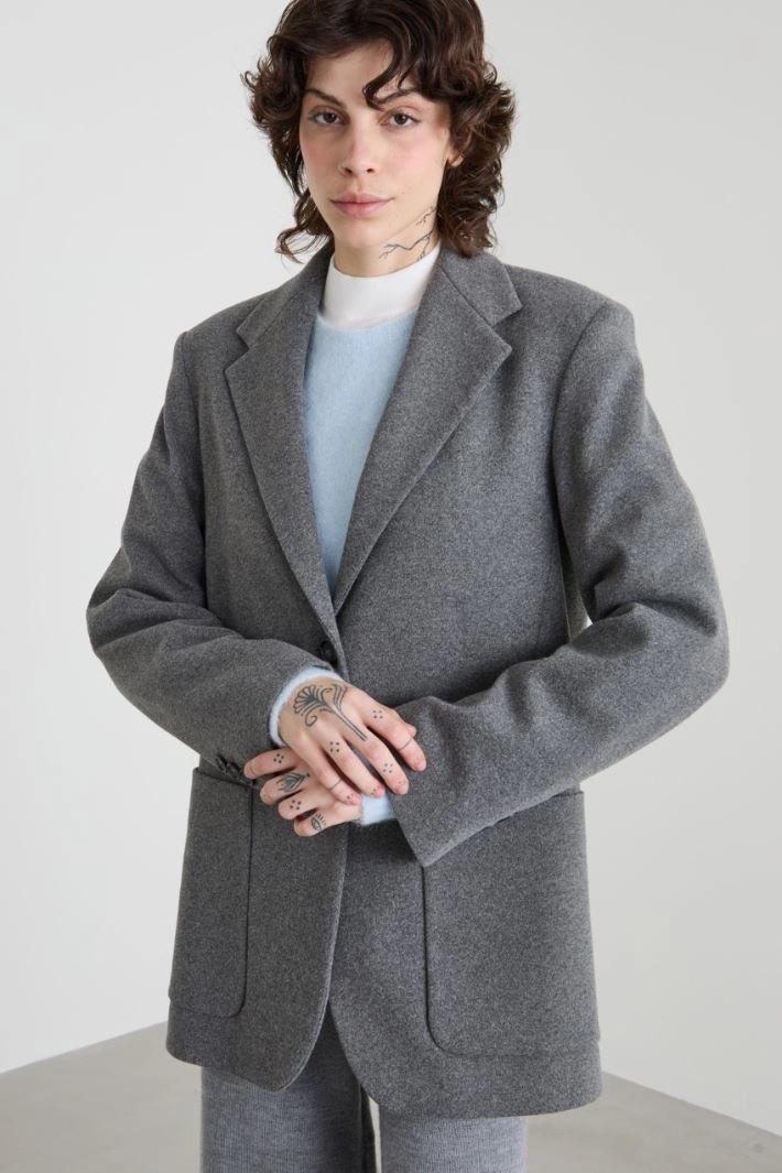 Straight-fit blazer in stretch cotton-blend flannel jersey, with lapel collar, long sleeves with buttons and side patch pockets. Central vent and single-breasted button fastening. Semi-lined garment.