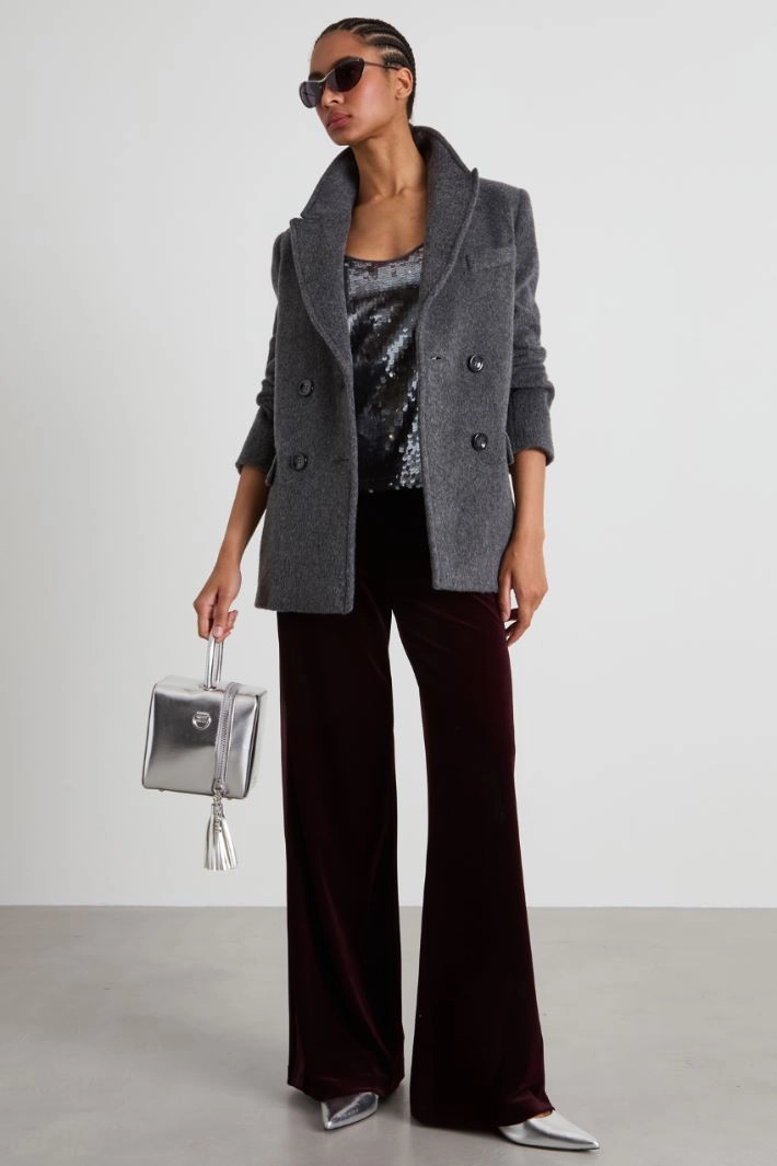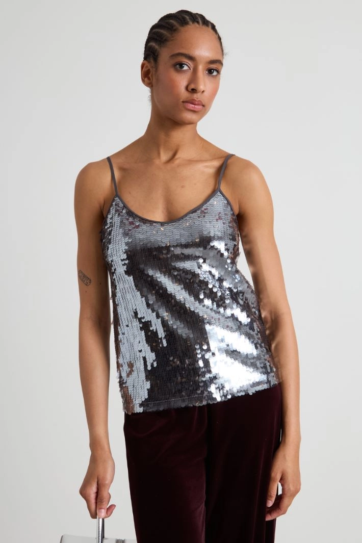 Straight-fit top in tulle covered with embroidered sequins, with a V-neck and thin shoulder straps. Lined.