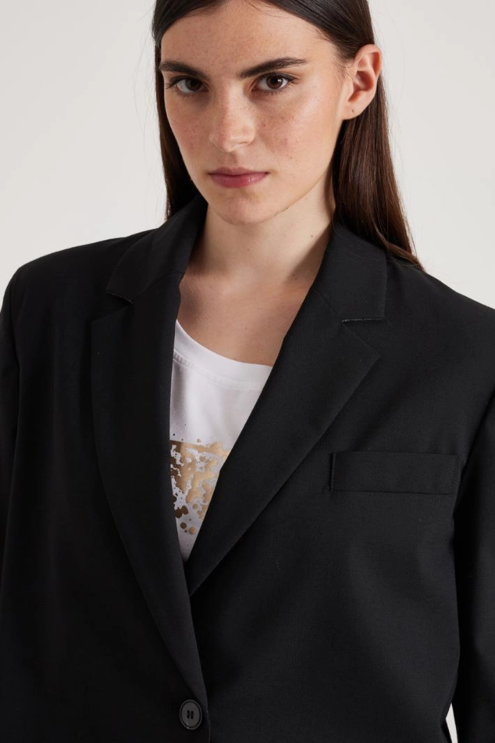 Cropped blazer with a straight cut in wool blend canvas, with a lapel collar, long sleeves with a slit and a welt pocket on the chest. Button fastening. Lined.
