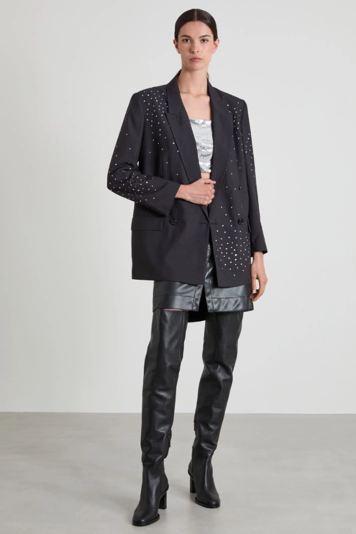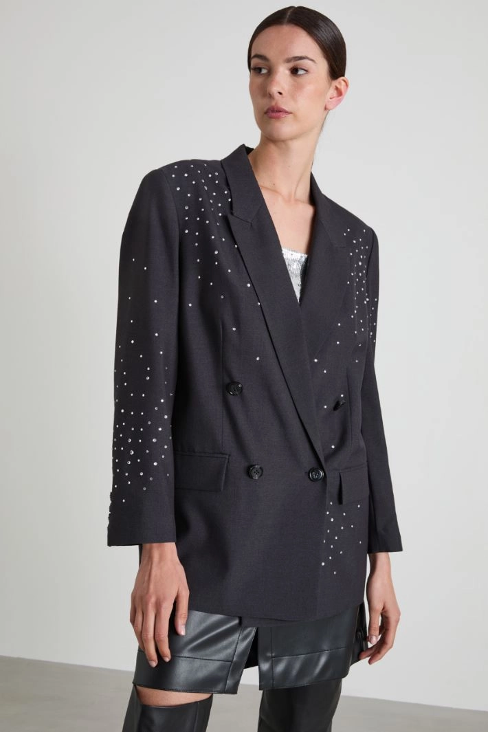 Regular fit blazer in viscose blend canvas with rhinestone applique motif, peak lapels, long sleeves with buttons, flap pockets and slit on the center back. Double-breasted fastening with buttons. Lined.