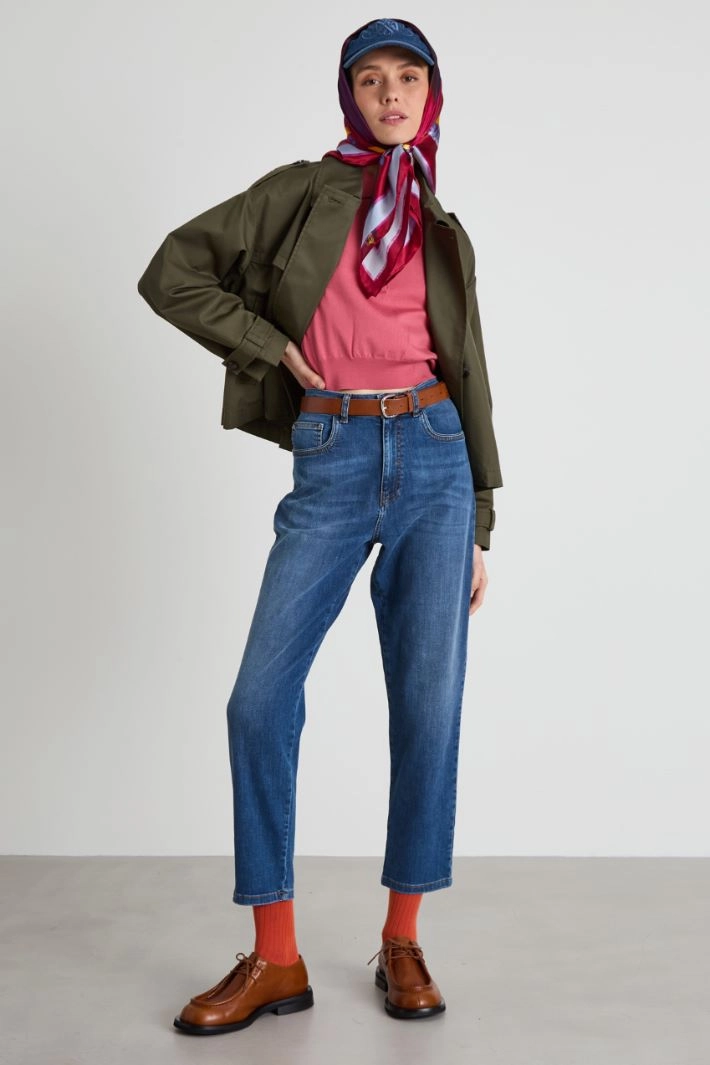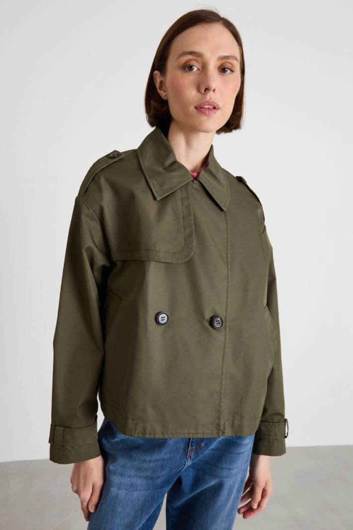 Short, straight-cut trench coat in water-repellent cotton-blend gabardine, with a shirt collar, shoulder epaulettes, long sleeves with adjustable wrist straps, and side welt pockets. Counter-pleat motif on the back and double-breasted button fastening. Unlined.