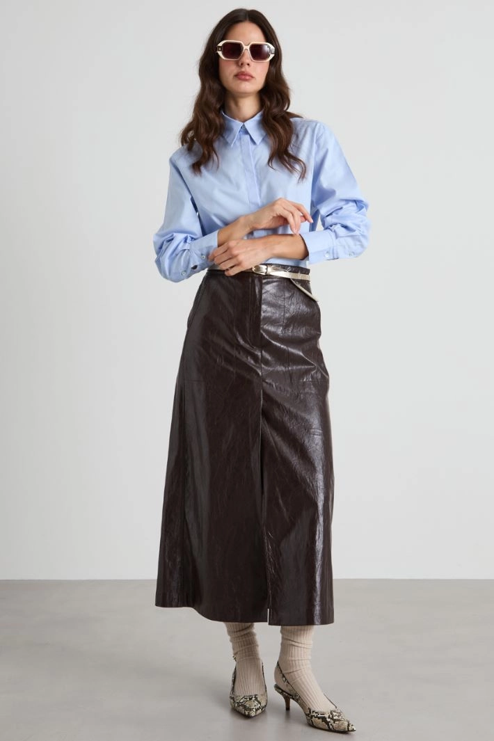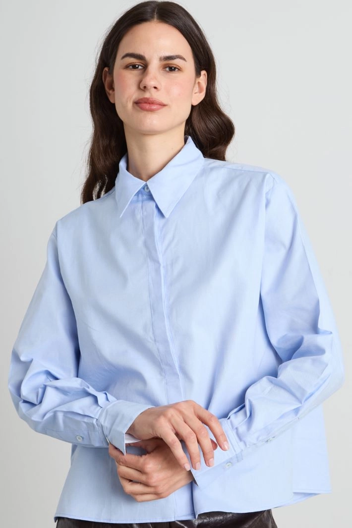 Boxy flared shirt in pure cotton Oxford, with shirt collar, long sleeves with cuff and buttons, counter pleat on the back and asymmetrical hem. Hidden button fastening.