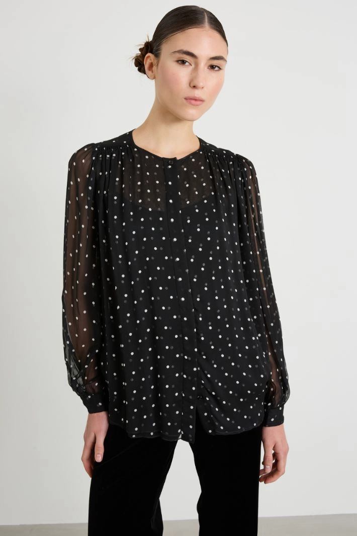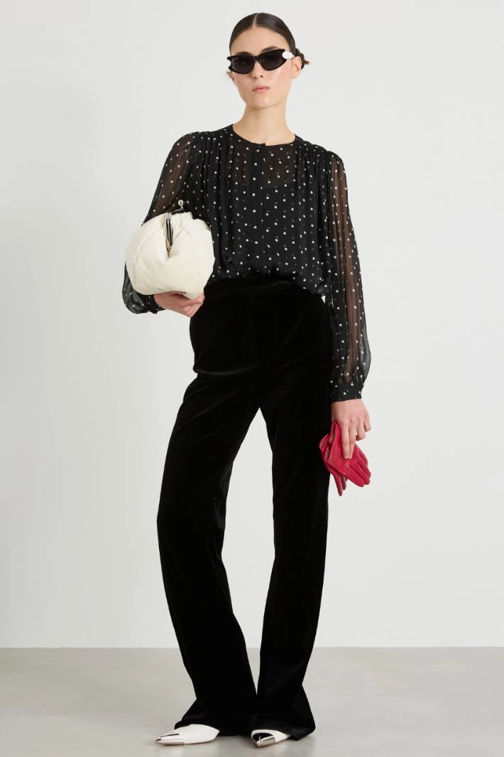 Flowing blouse in pure viscose crepon, with round neckline, long sleeves with cuff and button, yoke cut with gathering on the back and hidden fastening with buttons.