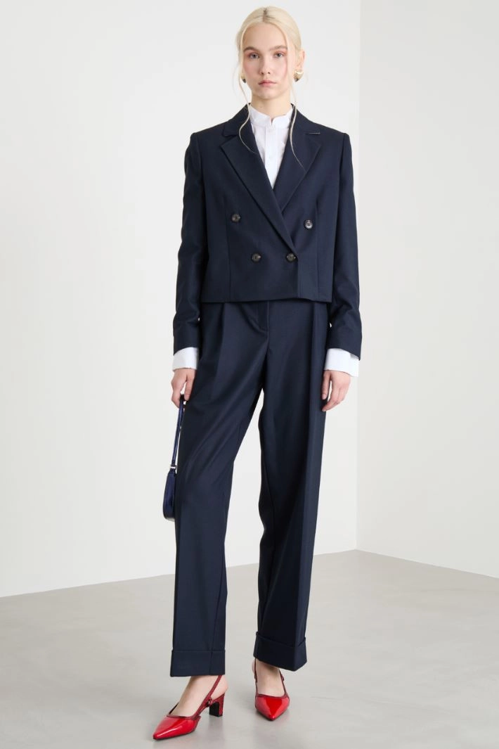 Wide-leg trousers crafted in pinstripe flannel, featuring belt loops and pleats at the waist, front French pockets and rear welt pockets. Fastening with a button and a concealed zip.