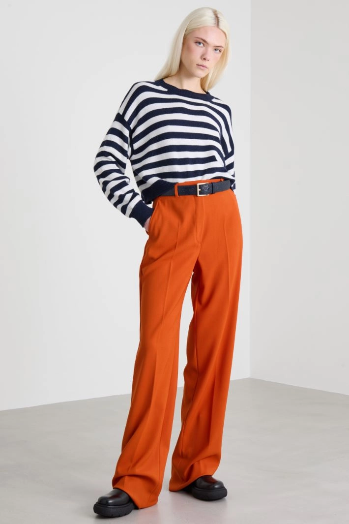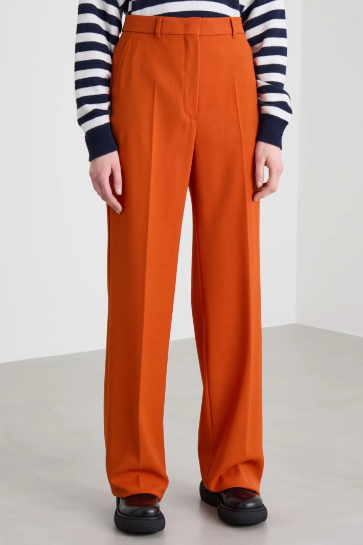 Straight-cut trousers in pure wool crepe with a topstitched finish, belt loops, French pockets and a crease pressed along the length. Concealed fastening with zip, button and hook.