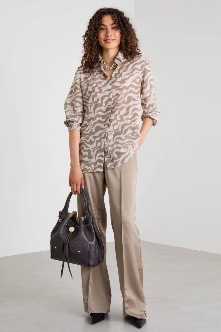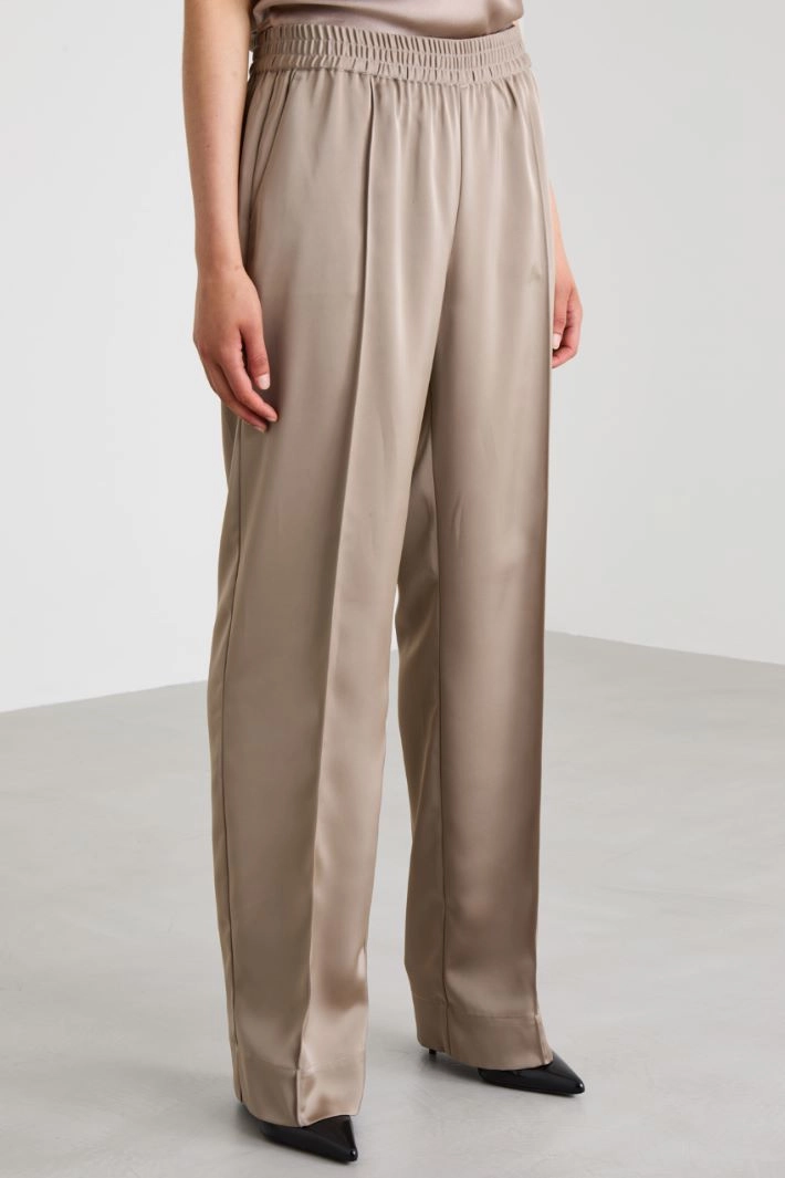 Straight and loose trousers in washed-effect satin, with elasticated insert at the waist, side French pockets and welt pockets at the back, pleat stitched along the length and slits at the bottom.