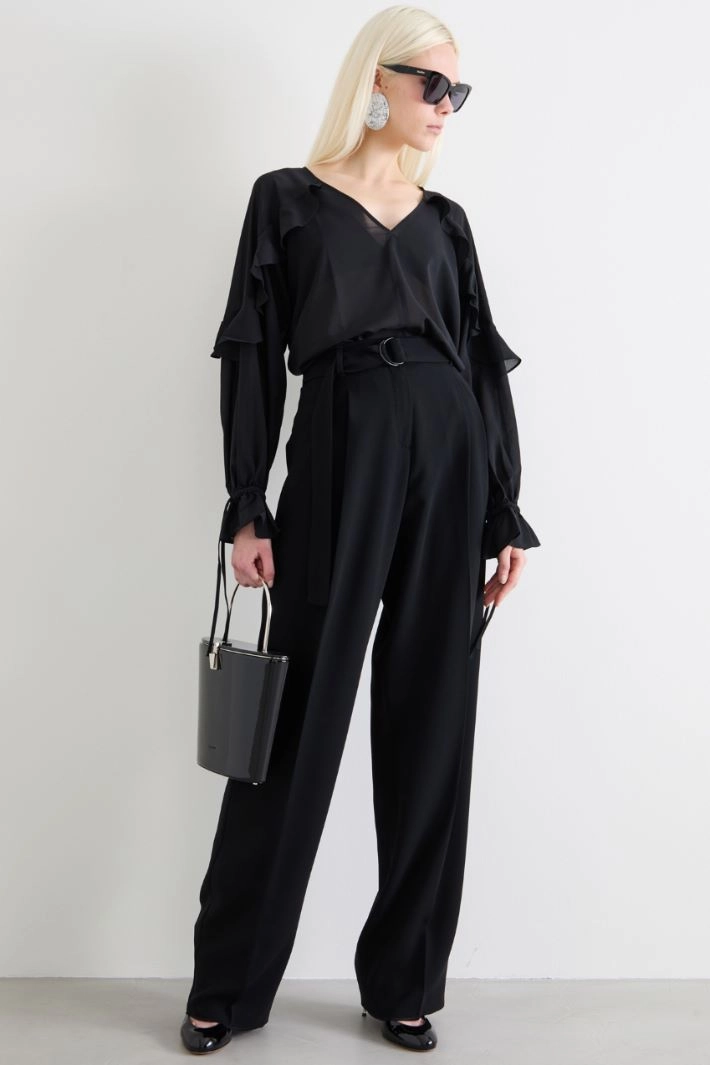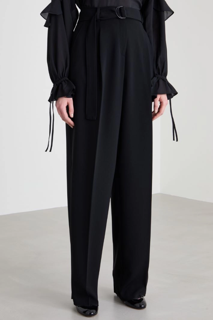 Loose-fit cady trousers with topstitching, belt loops, darts, French pockets and crease pressed along the length. Hidden fastening with zip, button and hook. Matching belt.