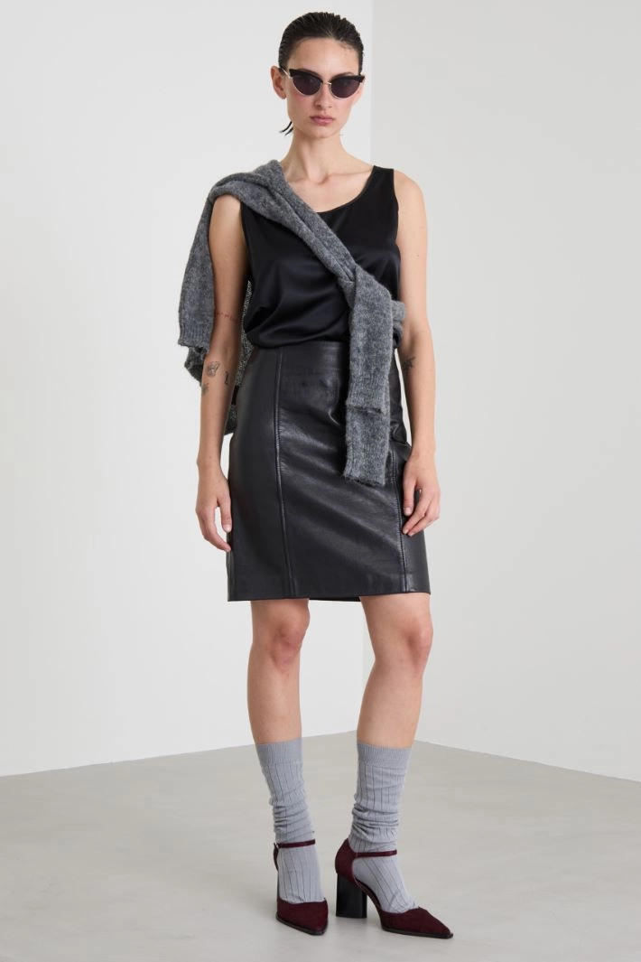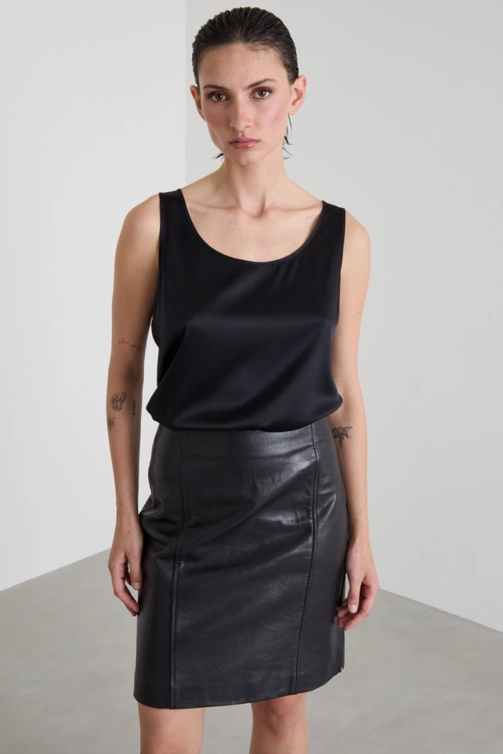 Straight-cut top in stretch silk satin, with U-neckline, wide shoulder straps and side slits at the bottom.