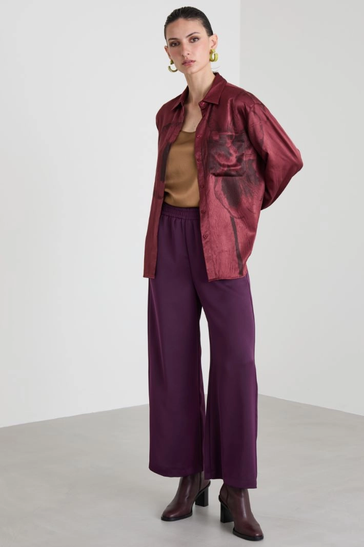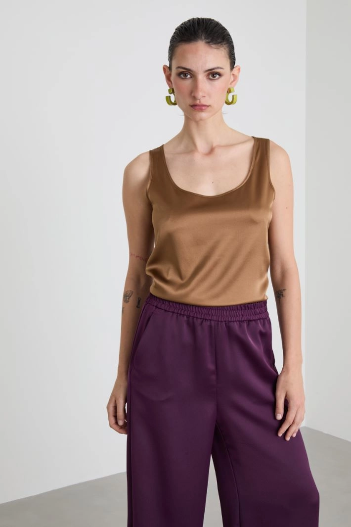 Straight-cut top in stretch silk satin, with U-neckline, wide shoulder straps and side slits at the bottom.