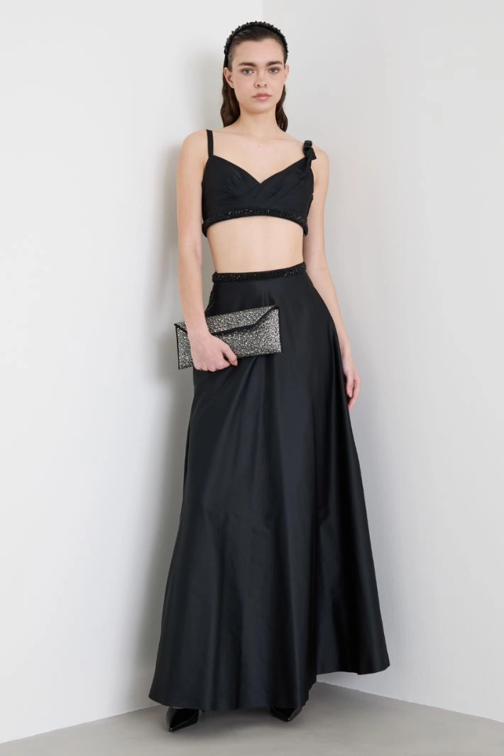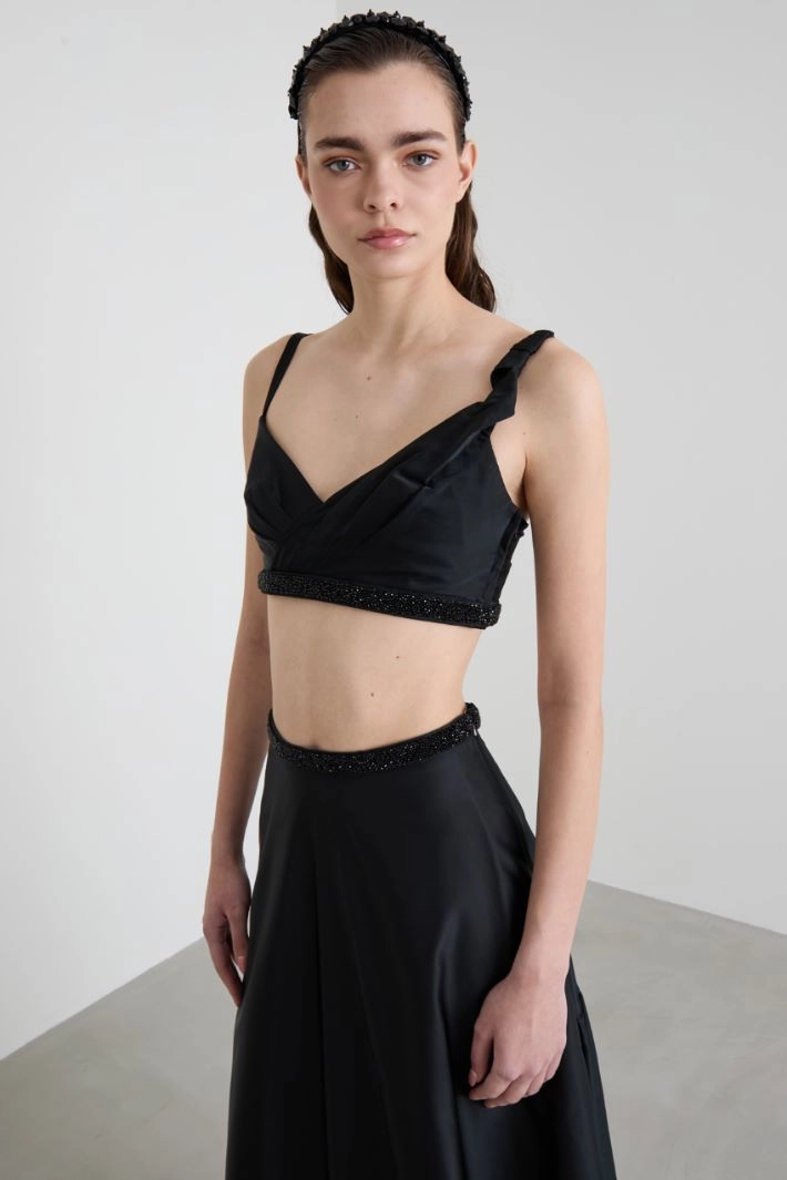 Fitted crop top in heavy cotton blend duchesse, with thin shoulder straps, pleated front and back, and matching crystal embroidery at the hem. Side zip fastening.