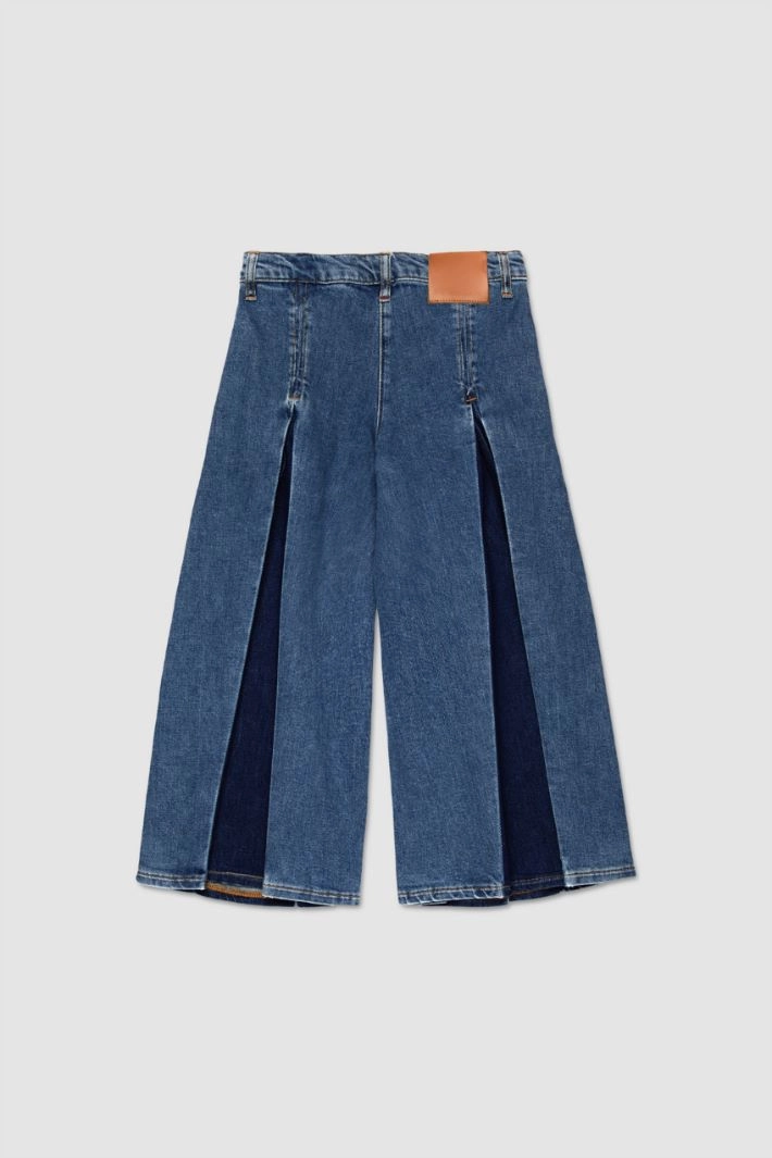 Five-pocket palazzo jeans in denim with contrasting pleats, belt loops, and front welt pockets. Concealed zip and button closure.