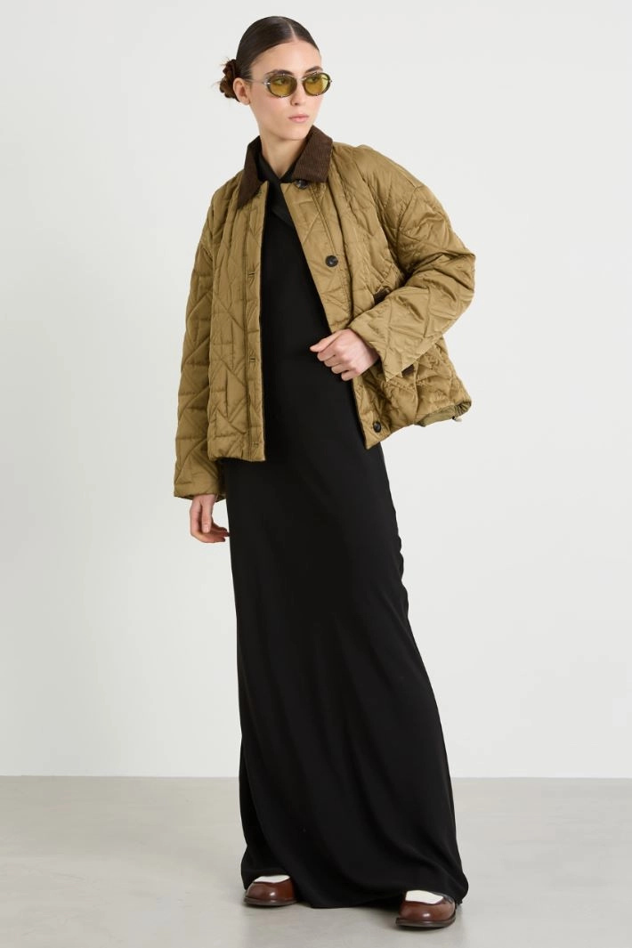 Long flowing dress in lightweight cady, with a crossover neckline in envers satin with a shiny finish and fastening with an invisible zip and hook on the side. Lined.