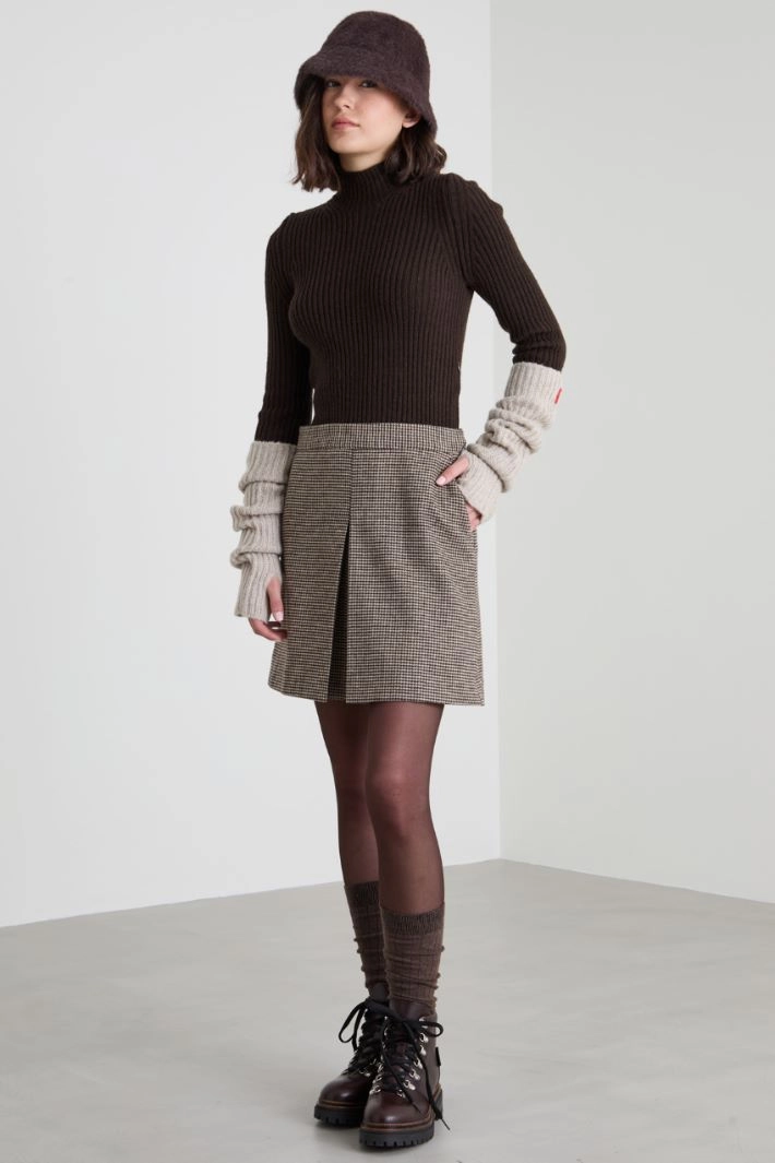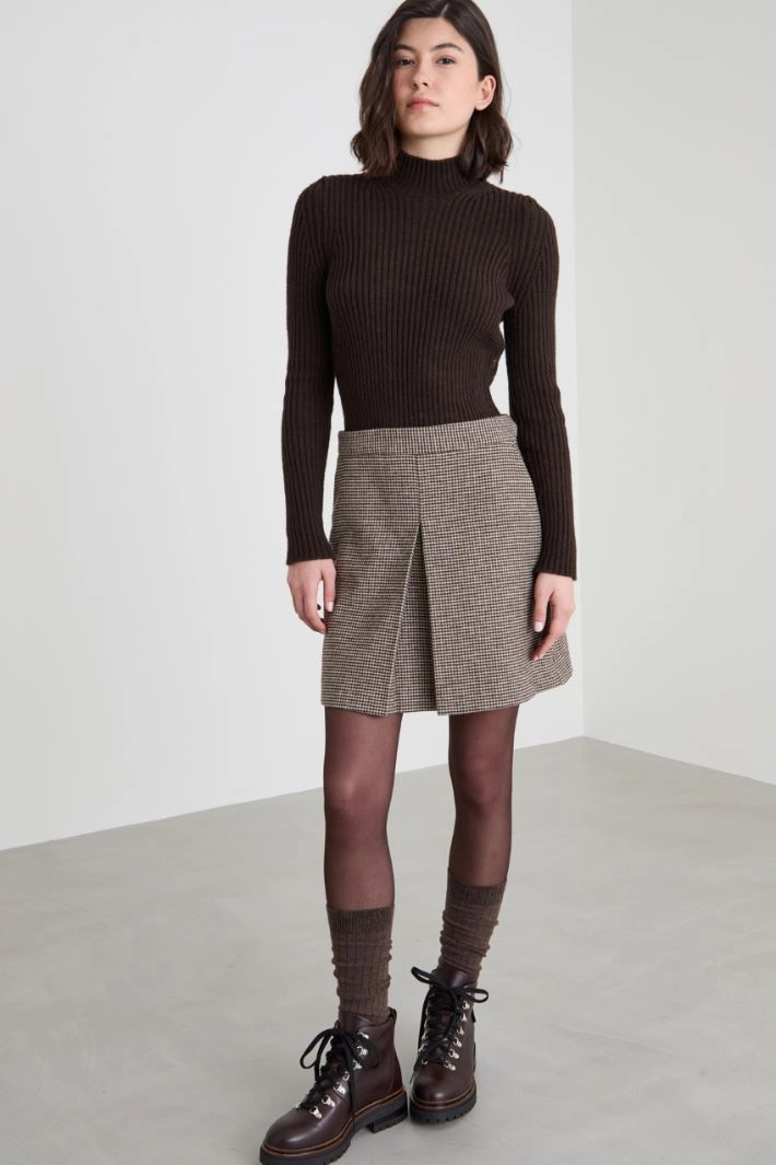 Semi-fitted dress in ribbed knit and wool blend houndstooth flannel, a high neck, long sleeves and a pleated skirt at the front. Concealed hook and zip fastening.