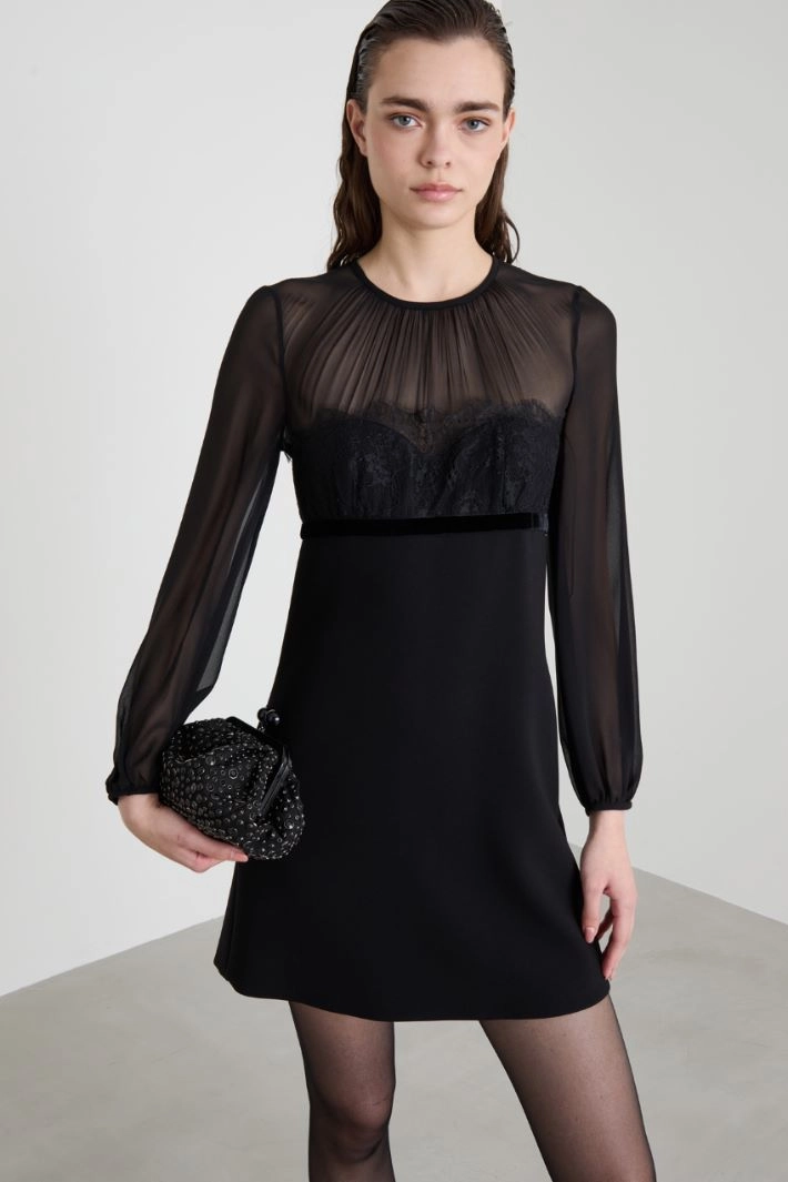 Short fitted dress in pure silk georgette for the top and cady for the skirt, with a round neckline and light gathering, lace insert on the chest and velvet ribbon at the waist, long puff sleeves and pockets inserted in the seams on the sides. Teardrop fastening with button at the back.