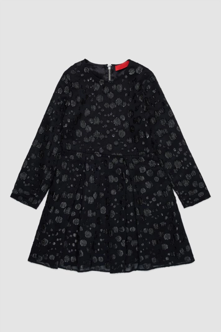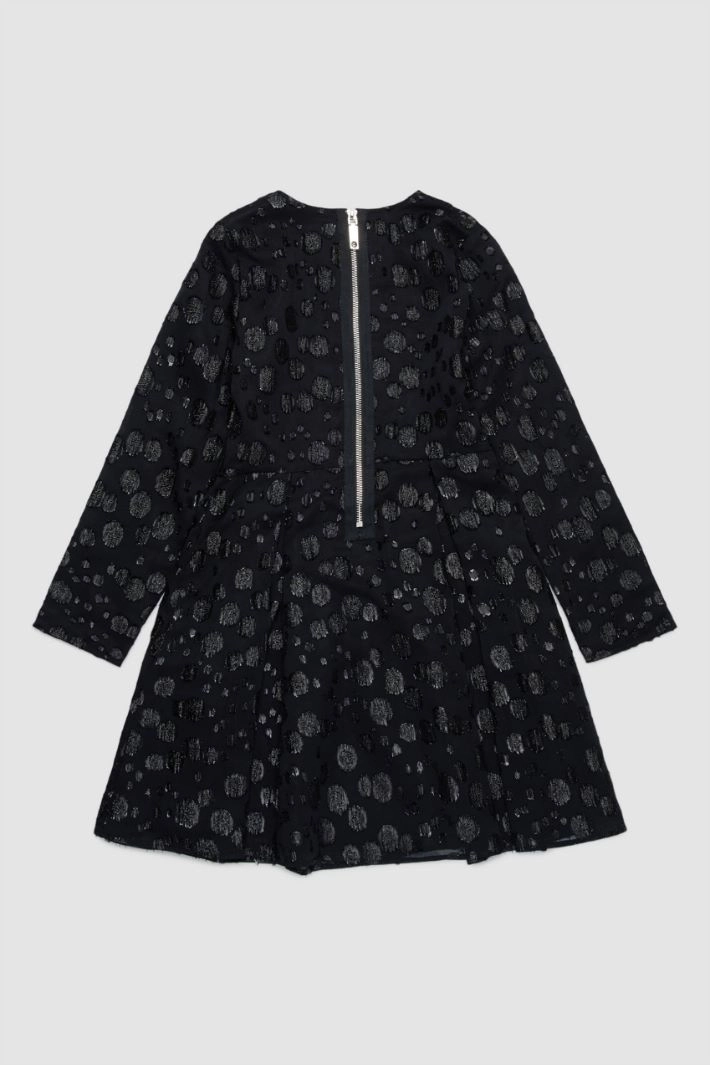 A-line dress in fil coupé fabric with a round neckline, long sleeves, allover lurex polka dot detailing, seam at the waist, and a full flared skirt. Visible zip closure at the back. Lined.