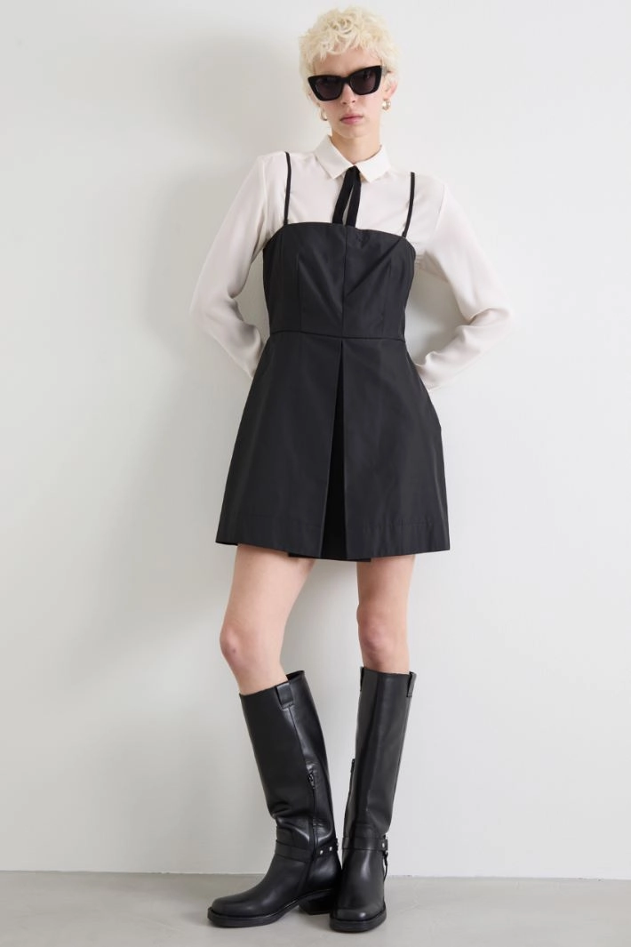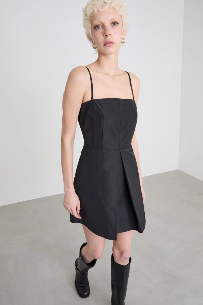 Short corolla duchesse dress with straight neckline, thin adjustable and removable shoulder straps, inset side pockets and skirt with pleated pattern. Invisible zip fastening on the side. Semi-lined.