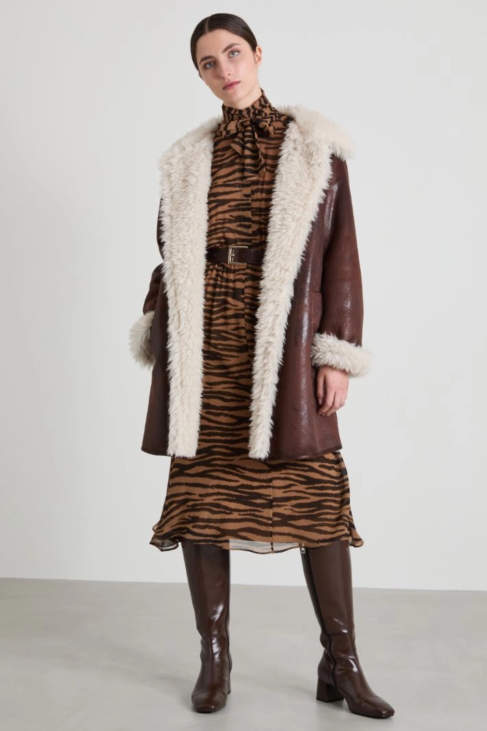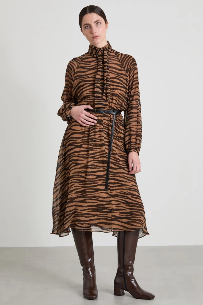 A-line dress in pure silk georgette with an all-over print, a self-tie scarf collar, long raglan sleeves with button, an elasticated waist and a flared skirt. Concealed button fastening. Matching slip and removable belt.