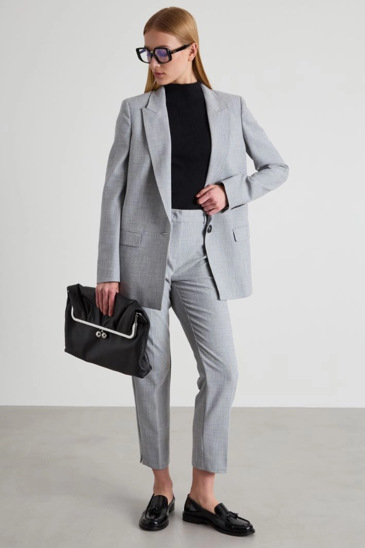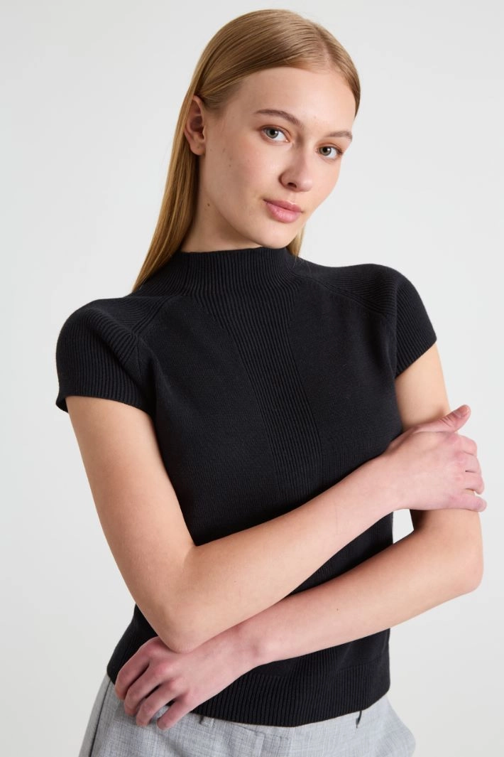 Fitted sweater in cotton and viscose yarn, with ribbed details, high neck and short raglan sleeves.