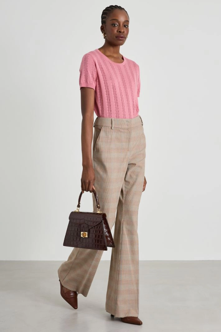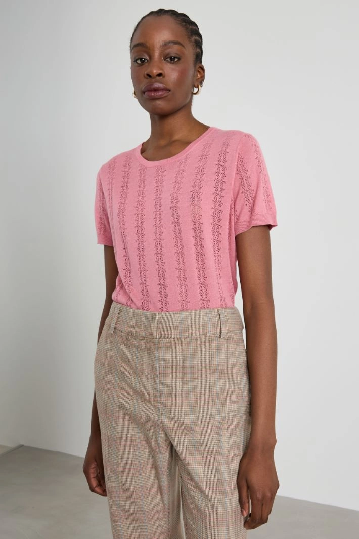Semi-fitted openwork sweater in silk and wool yarn, with a crew neck, short sleeves and ribbed edges.