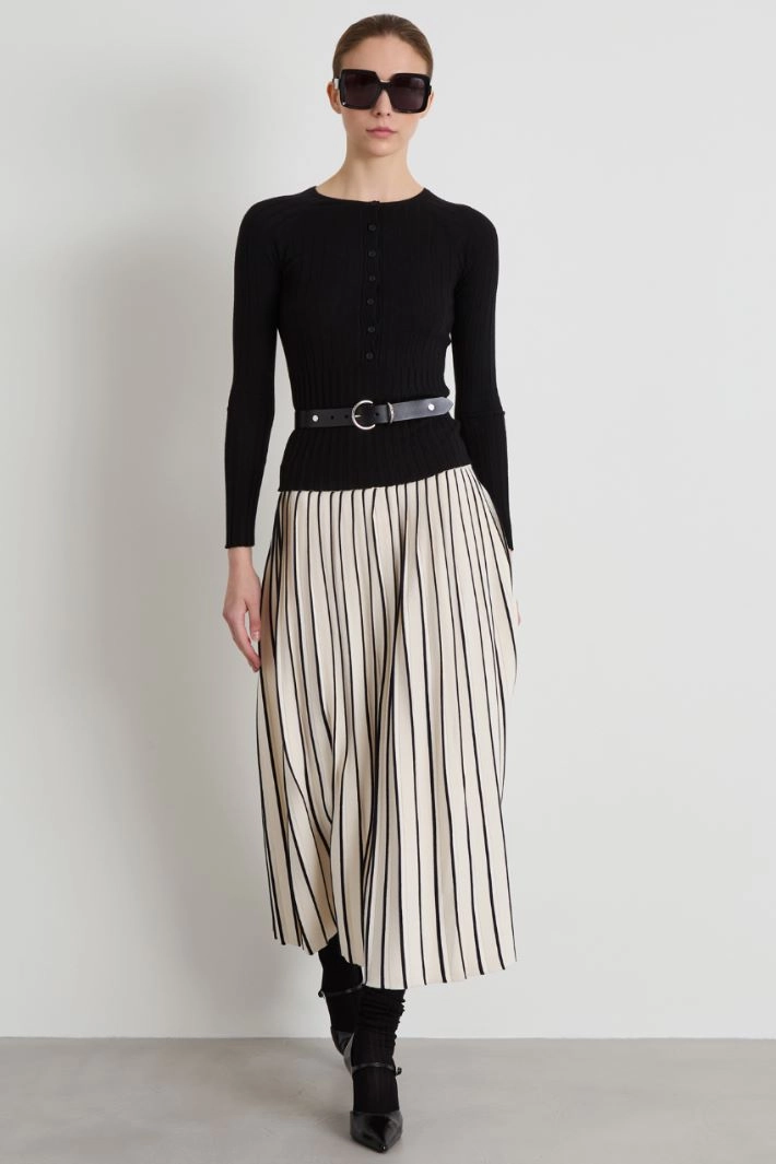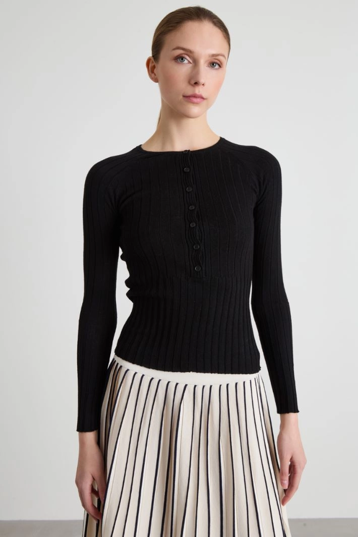 Fitted sweater in flat ribbed wool blend, with deep round neckline and button fastening.