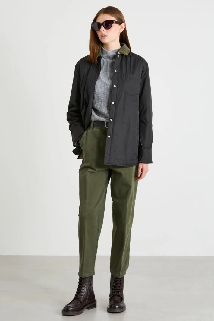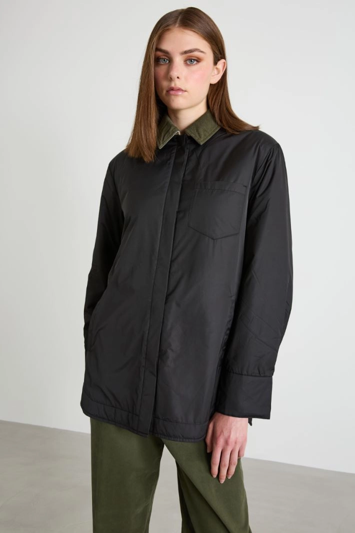 Padded straight-fit shirt in technical satin, with classic corduroy collar, long sleeves and breast pocket and side welt pockets. Openable side slits, yoke cut with box pleat and rounded bottom longer on the back. Hidden fastening with press studs.