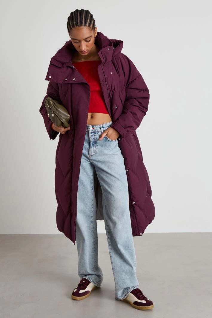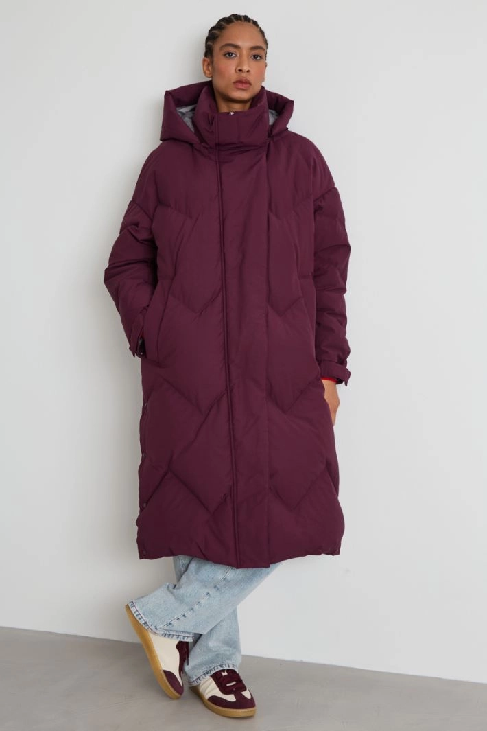 Long down jacket with a straight and loose fit in technical cotton blend fabric that is water-resistant and quilted, with a high collar, removable hood, long sleeves with a dropped hem and elastic cuff and side welt pockets. Side slits that can be opened and hidden fastening with a double-slider zip and press studs.