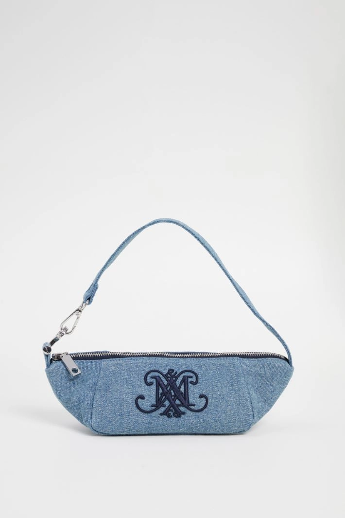 Cotton bag with embroidery, handle with metal snap hook and zip closure.