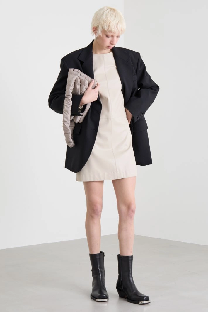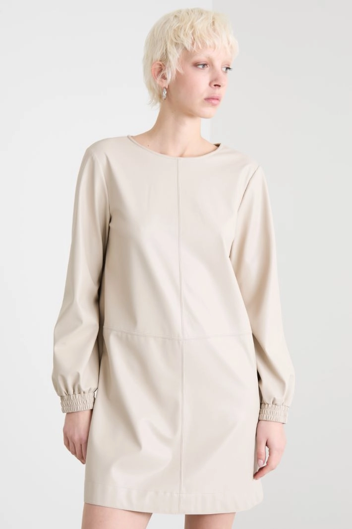 Short, straight-cut dress in faux leather-coated jersey, with a stitched cut motif, crew neck, long sleeves with elastic cuffs and invisible zip fastening on the back.