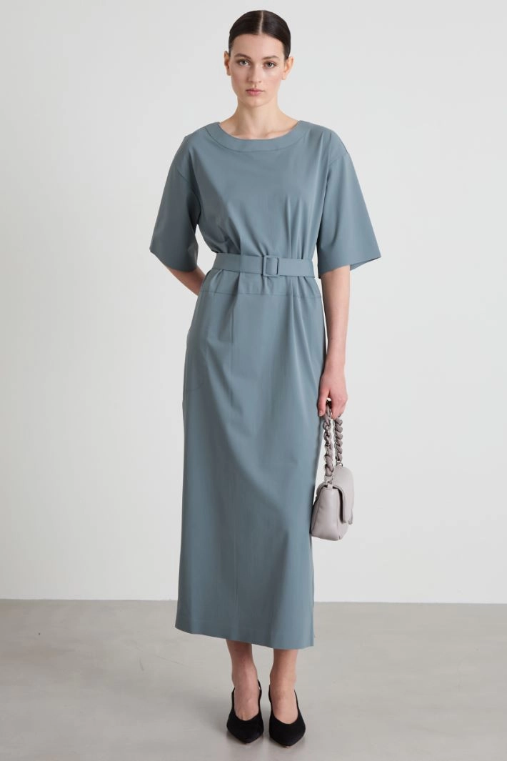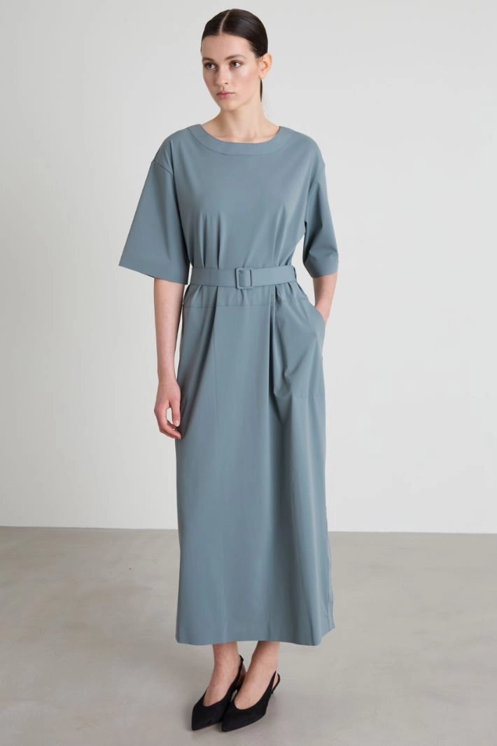 Straight-cut in technical jersey, with round neckline, elbow-length sleeves, French pockets, side slits at the bottom and matching belt.