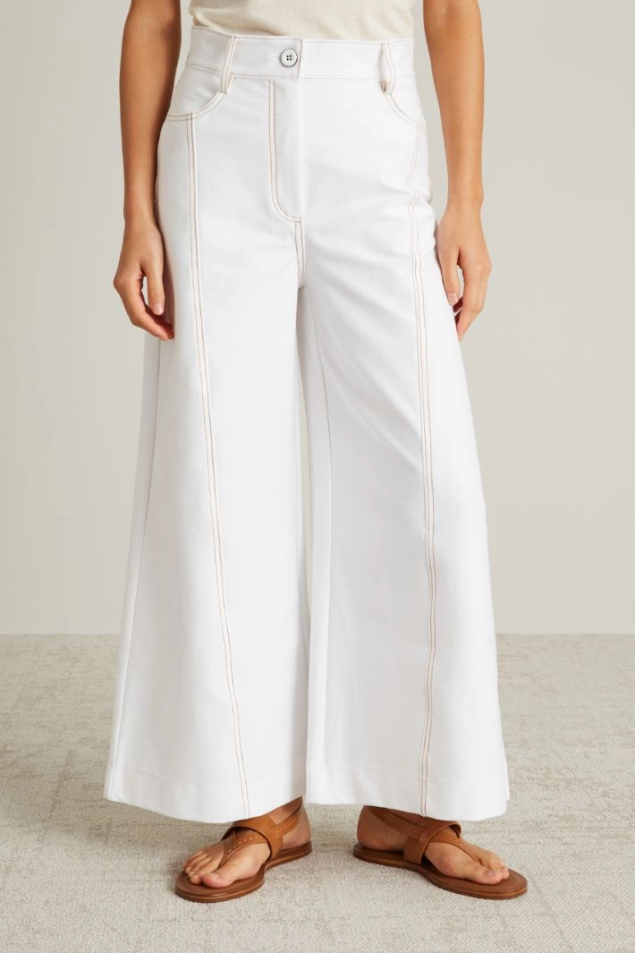 Flared trousers in stretch cotton blend jersey with a denim effect, with contrasting stitching, belt loops at the waist, side French pockets and patch pockets on the back, fastening with hidden zip and button.