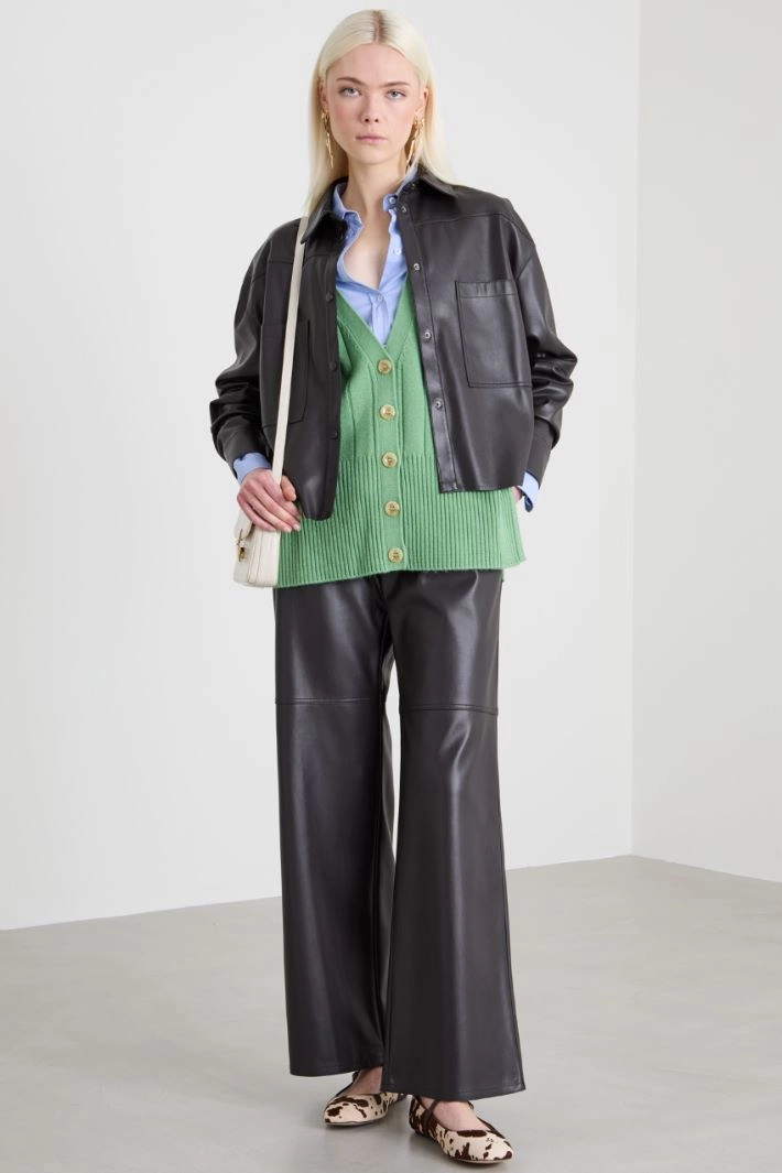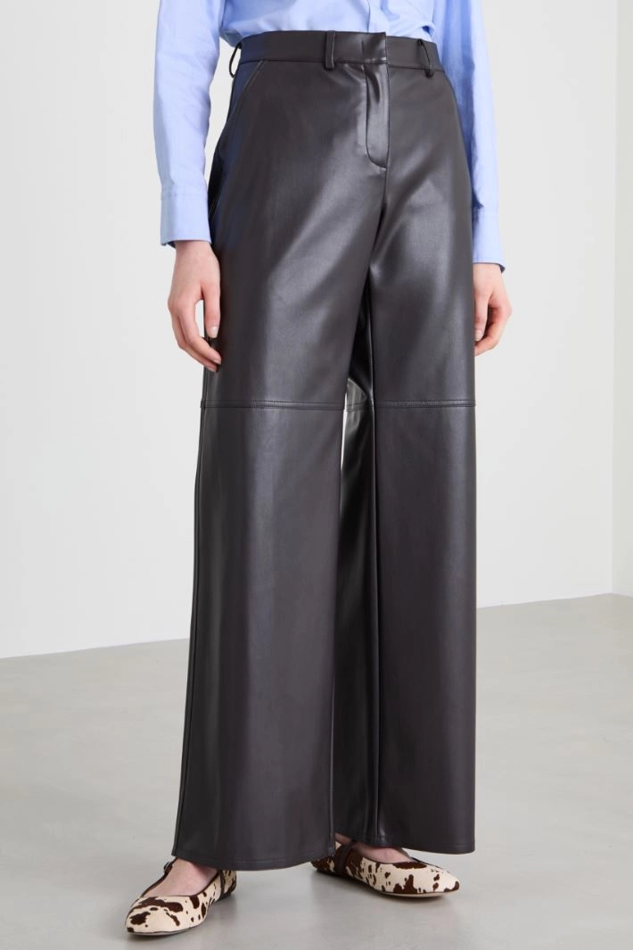 Straight-cut trousers in faux leather, with belt loops at the waist, French pockets at the front and patch pockets at the back. Hidden fastening with zip and hook.