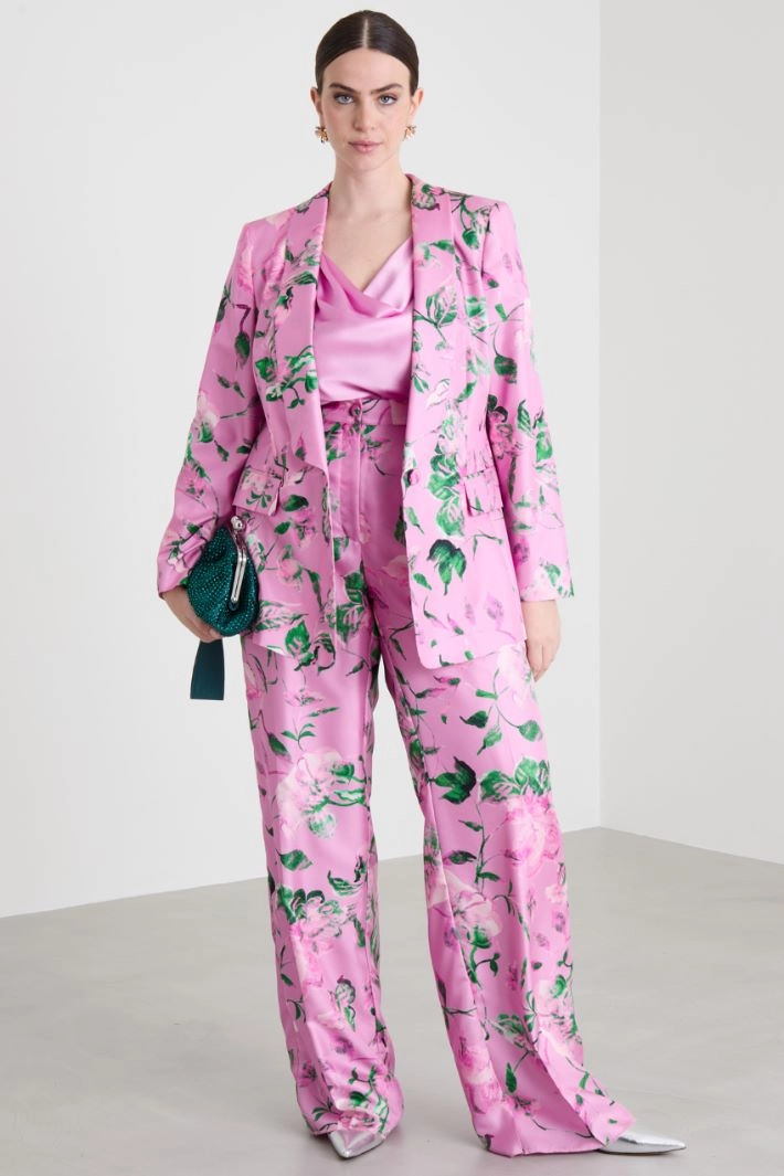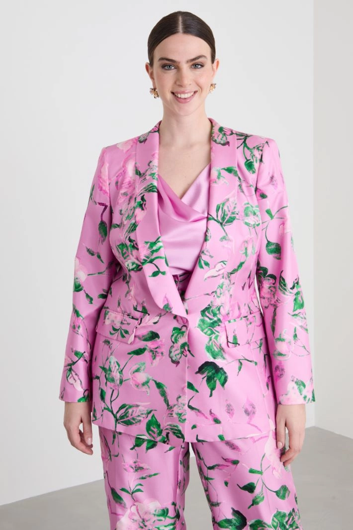 Slightly fitted blazer in printed pure silk twill, with shawl collar, long sleeves and double-welt side pockets with flap. Single-breasted fastening with covered button. Lined.