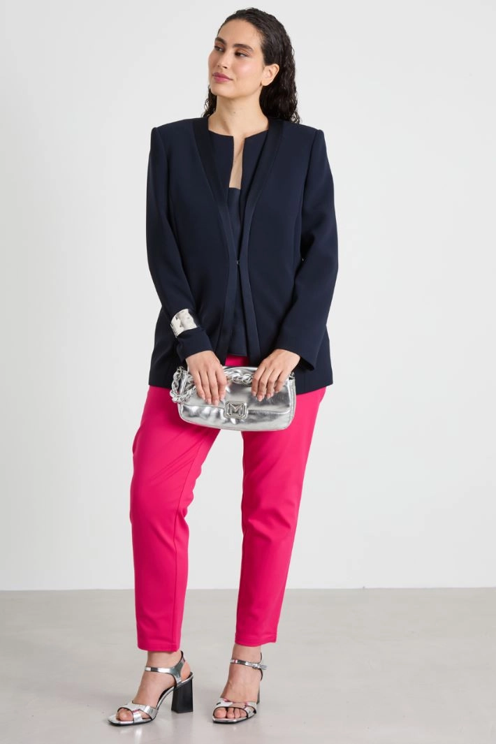 Semi-fitted cady blazer with long sleeves and padded shoulders. Single hook fastening. Lined.