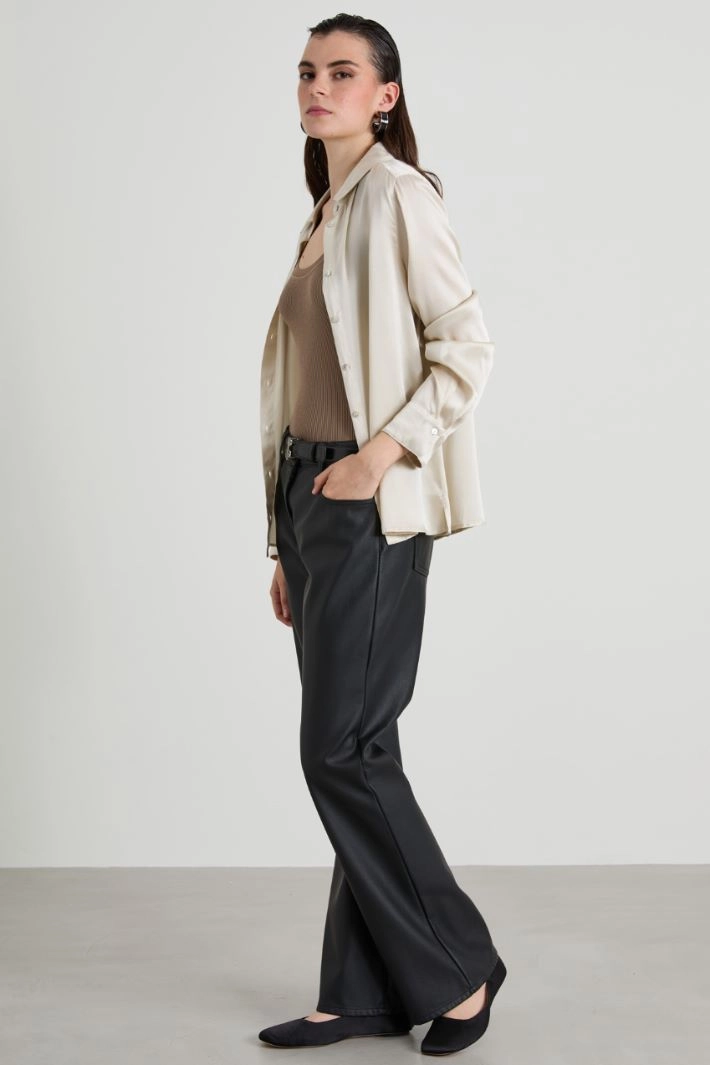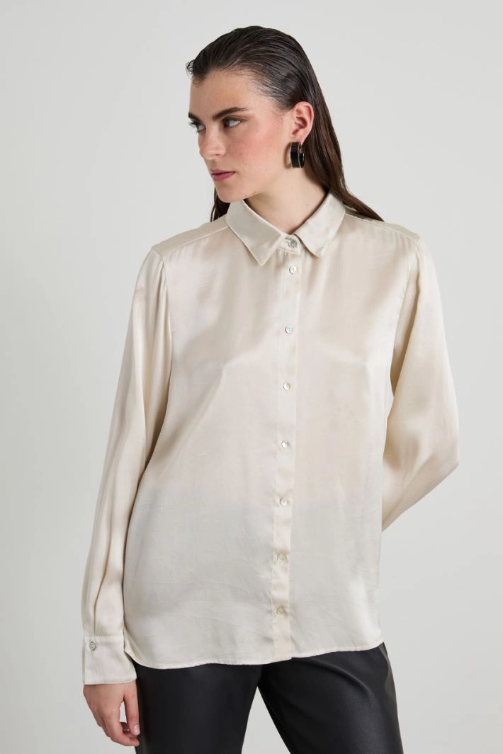Straight-cut blouse in pure silk satin, with a classic collar and long sleeves with cuffs and buttons. Button fastening.