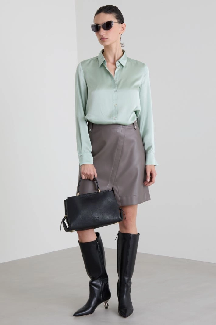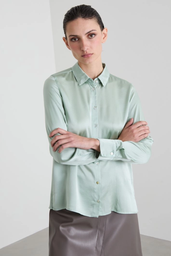 Straight-cut blouse in pure silk satin, with a classic collar and long sleeves with cuffs and buttons. Button fastening.