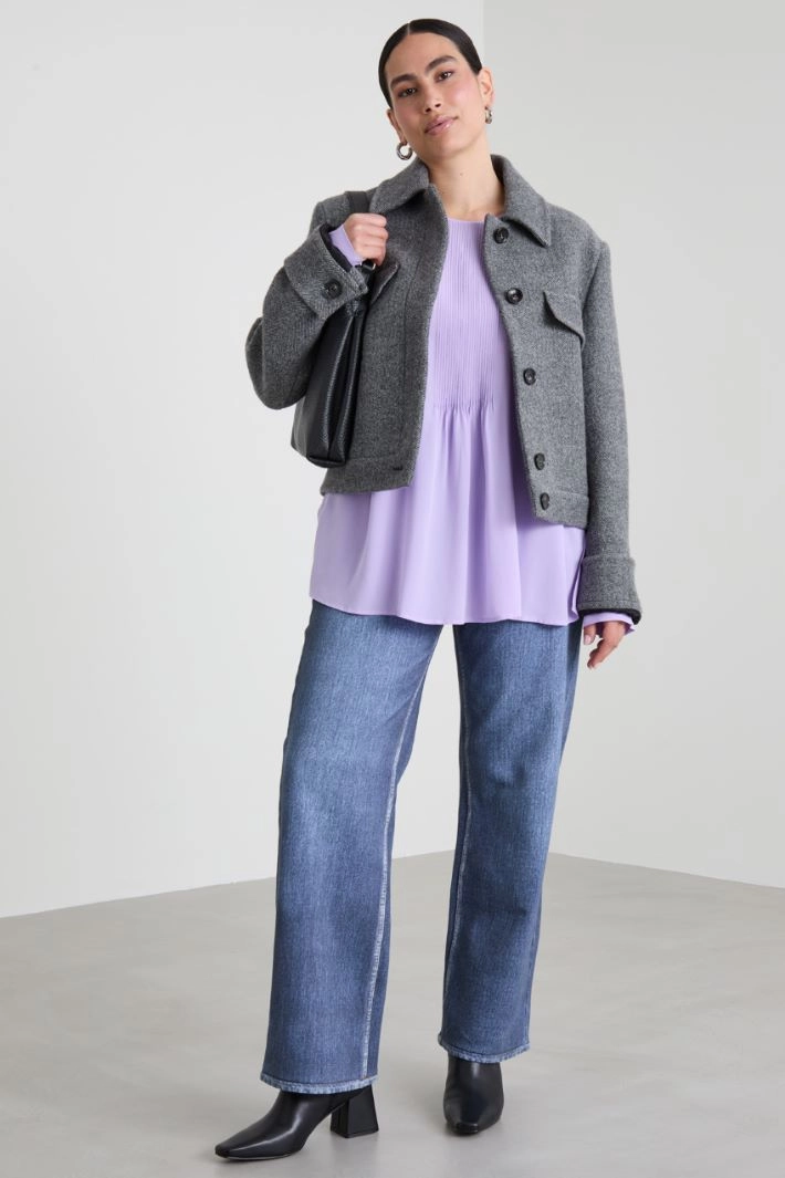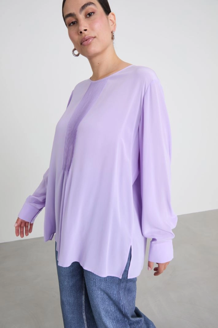 Regular-fit blouse in pure silk crepe de chine, with a pleated motif sewn onto the front, crew neck, long sleeves with buttons and side slits. Button fastening on the back.