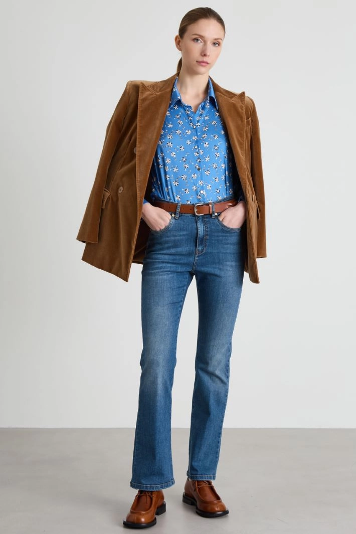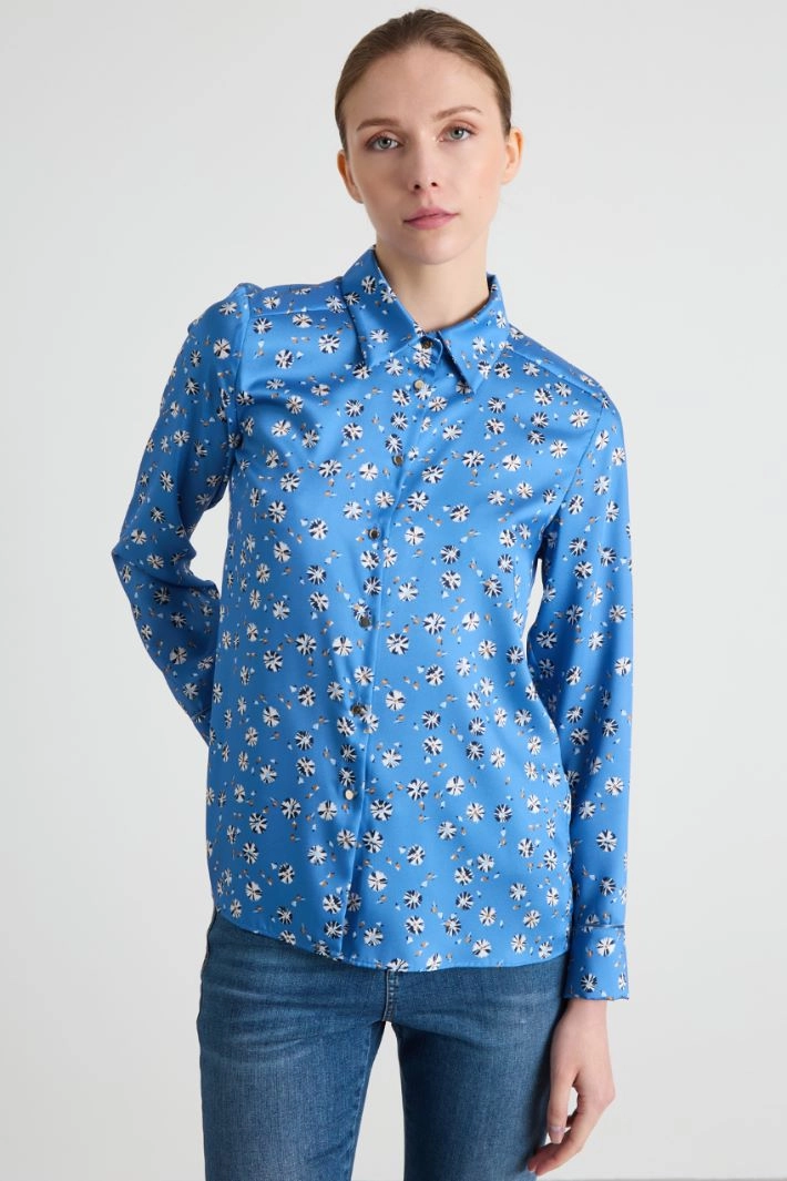 Flowing shirt in printed twill, with classic collar, long sleeves with ruffle trimmed with matching piping and buttons, and yoke with box pleat on the back. Button fastening.