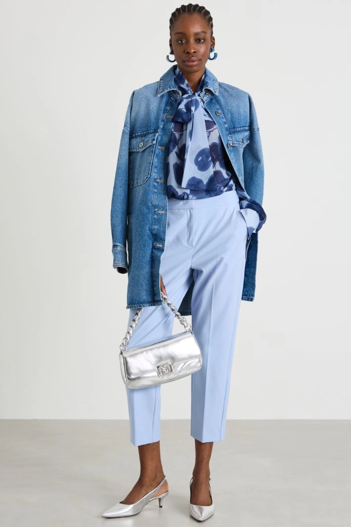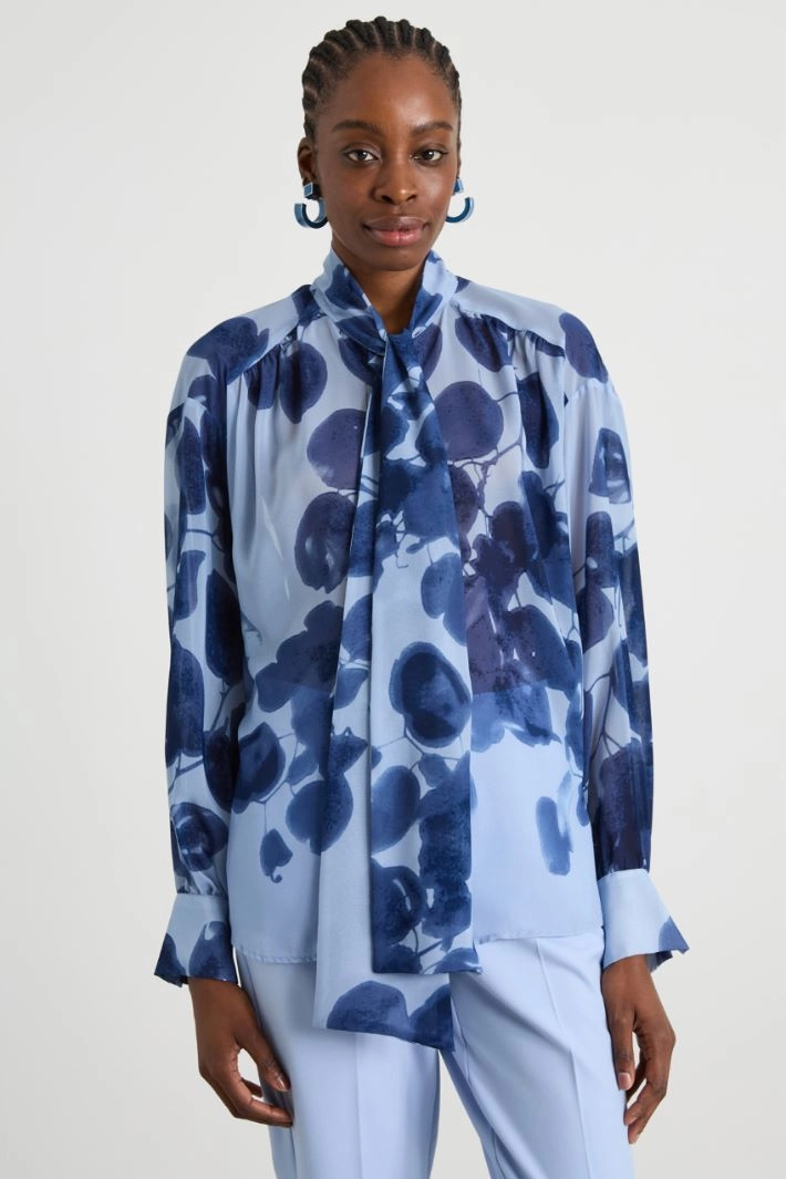 Straight-cut chiffon shirt with self-tie sash, long sleeves with buttoned cuffs. Button fastening.