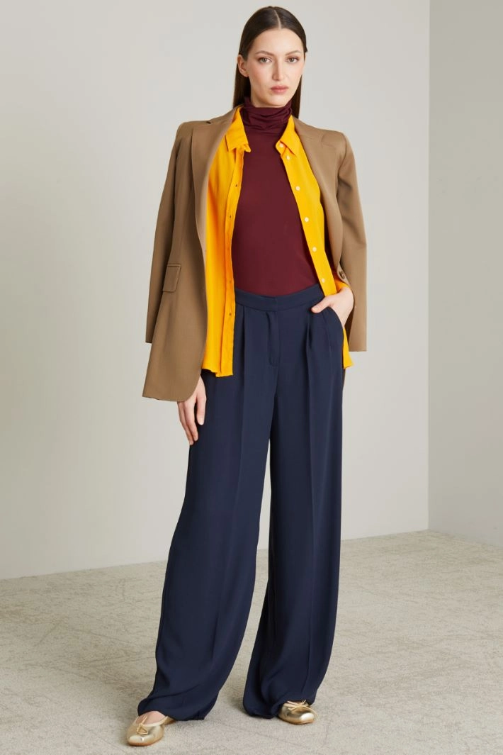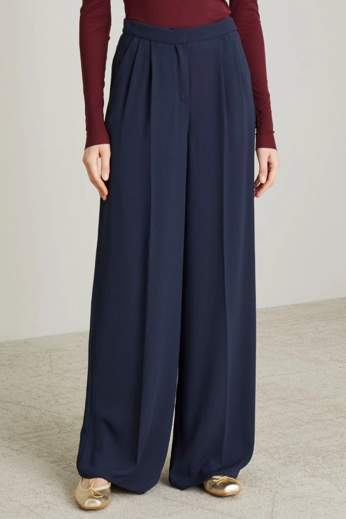 Wide-leg cady trousers with pleats sewn at the waist, French side pockets and single welt pocket on the back, hidden fastening with zip, button and hook.