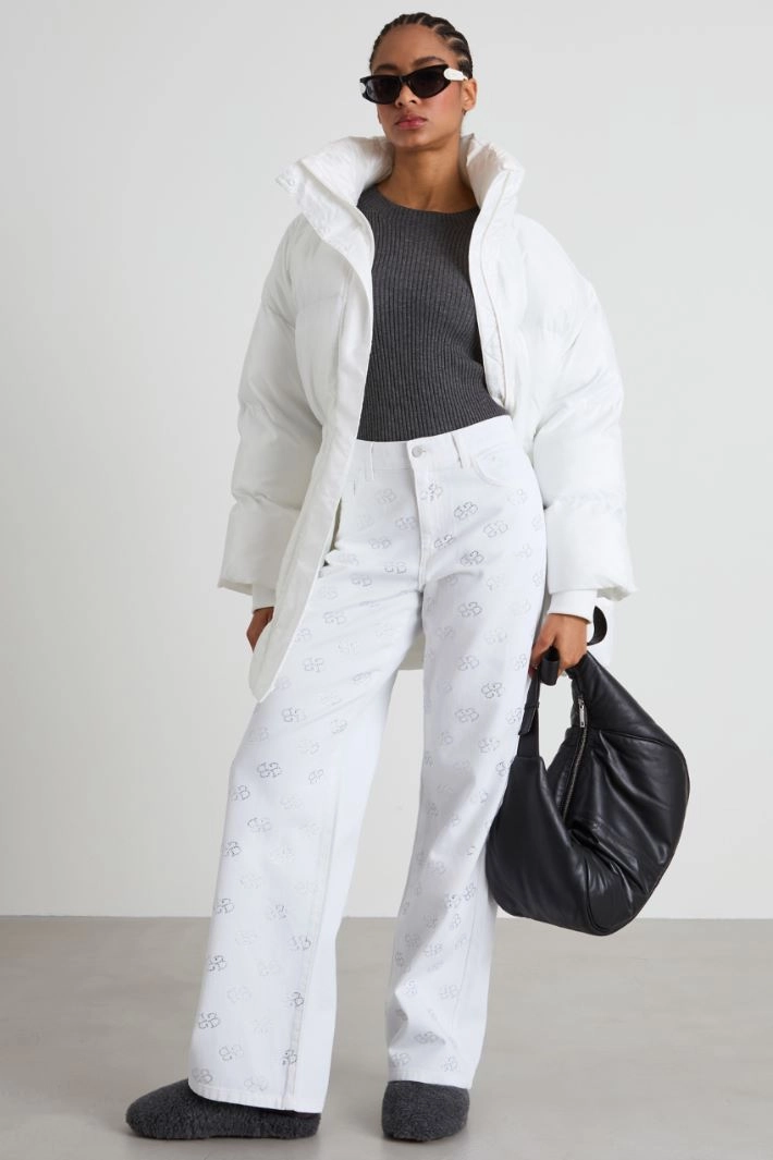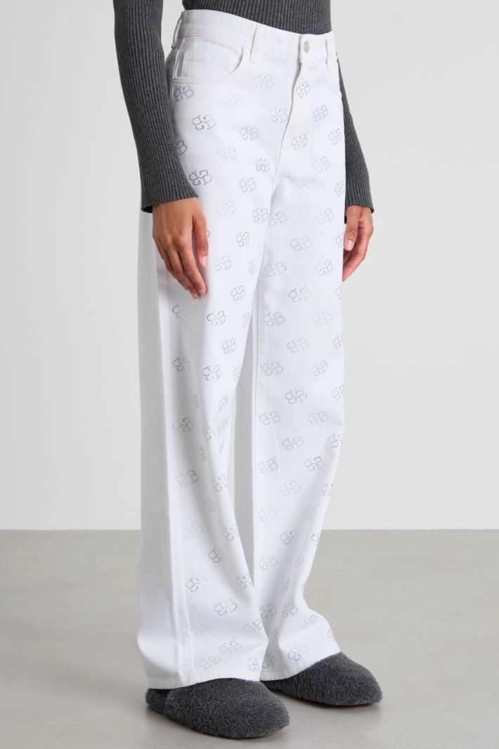Loose-fit trousers in pure cotton bull, with rhinestone motif applied on the front, belt loops, five pockets and fastening with hidden zip and button.