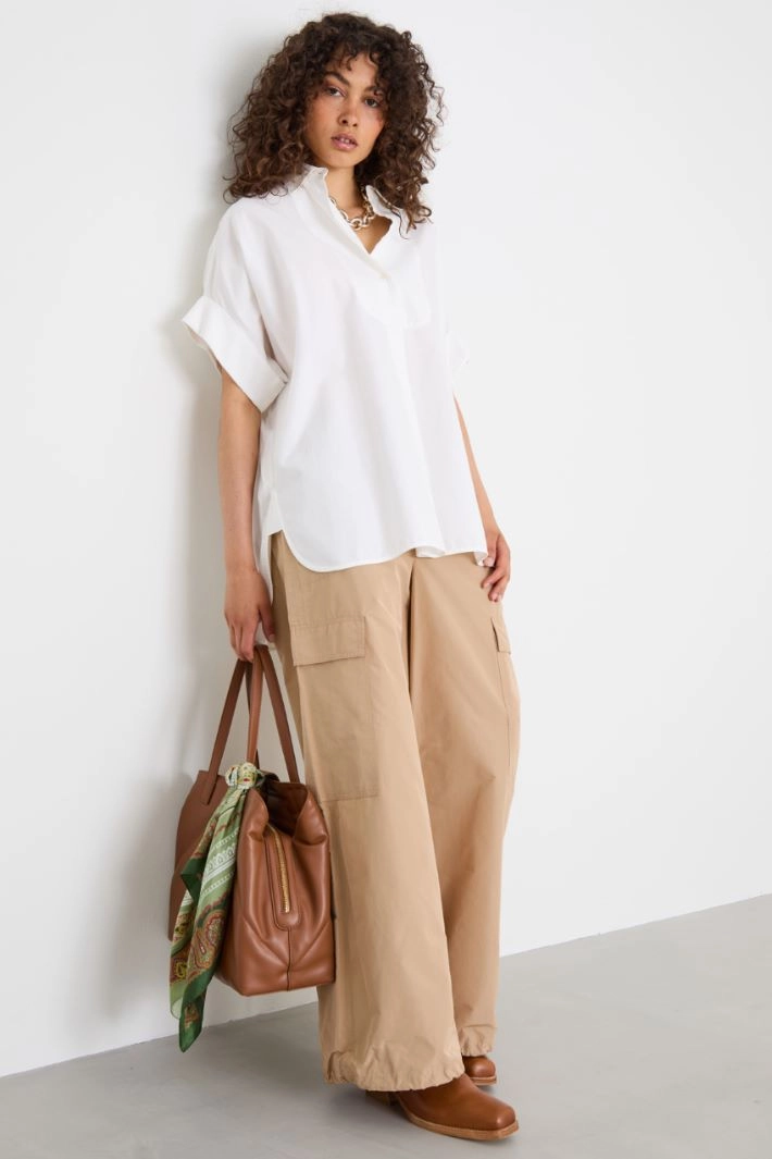 Cargo trousers in cotton blend taffeta, with elastic drawstring waist at the back, side welt pockets, single at the back and applied with flap along the leg. Adjustable drawstring at the bottom of the garment.